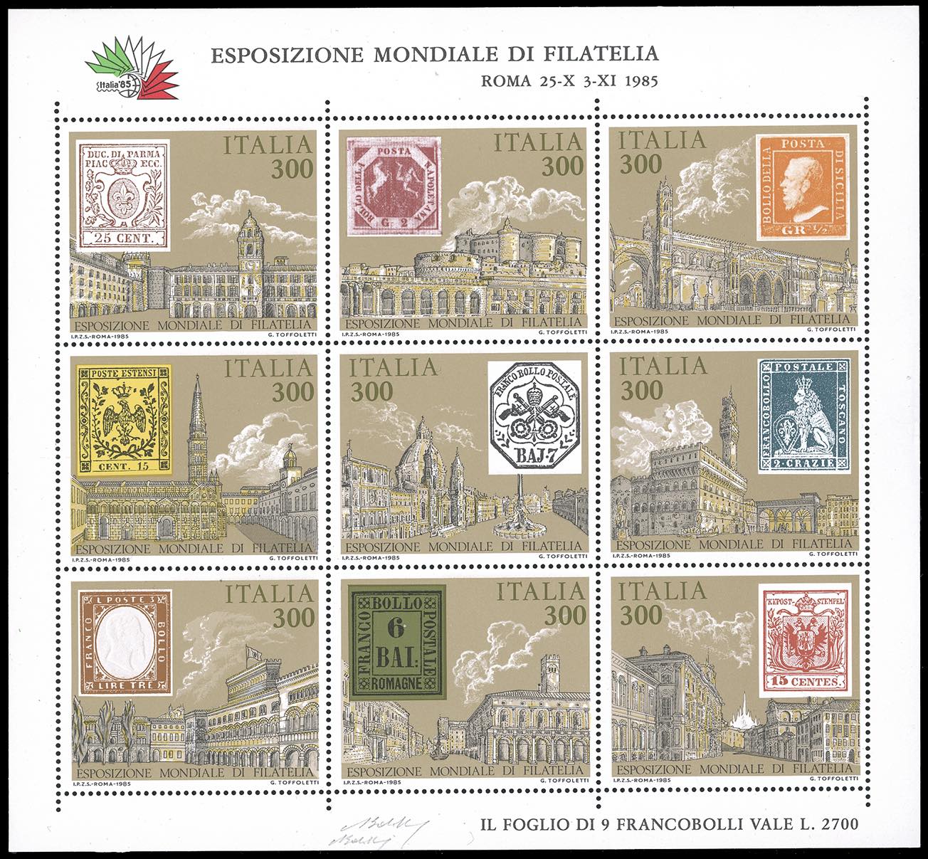 1985 - 300 lire Italia '85, foglietto, senza la stampa del colore del fondo del francobollo dello Stato Pontificio e del nome di tutte le città, francobollo naturale "7 baj bianco" (Sass. 1741a, Bol. 1853B/BF22B), nuovo, gomma originale integra, perfetto.