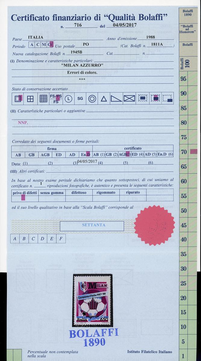 1988 - 650 lire Milan, senza la stampa del giallo, francobollo naturale "Milan azzurro" (Sass. 1836a, Bol. 1954B), nuovo, gomma originale integra, perfetto. Splendido e raro, pochi esemplari esistenti. Firmato Enzo Diena, cert. finanziario Bolaffi.
