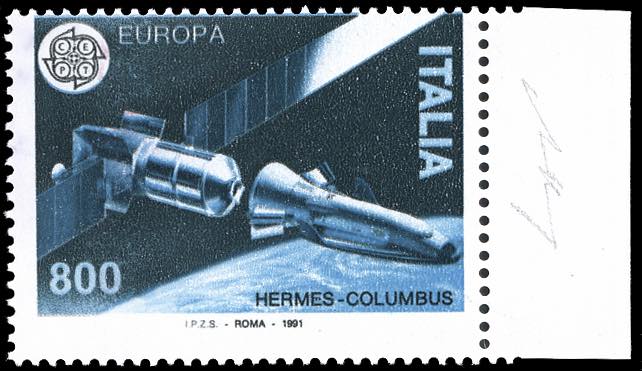 1991 - 800 lire Europa CEPT Spazio, francobollo naturale "Hermes-Columbus azzurro" (Bol. 2084B), bordo di foglio a destra, nuovo, gomma ... Leggi tutto