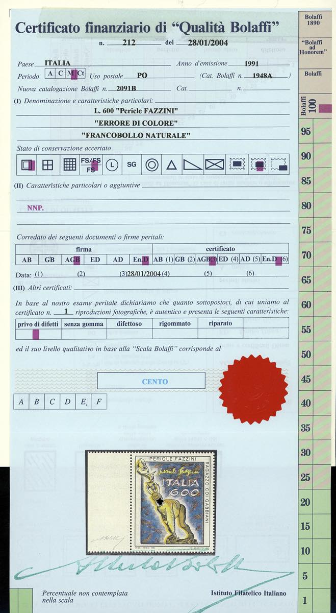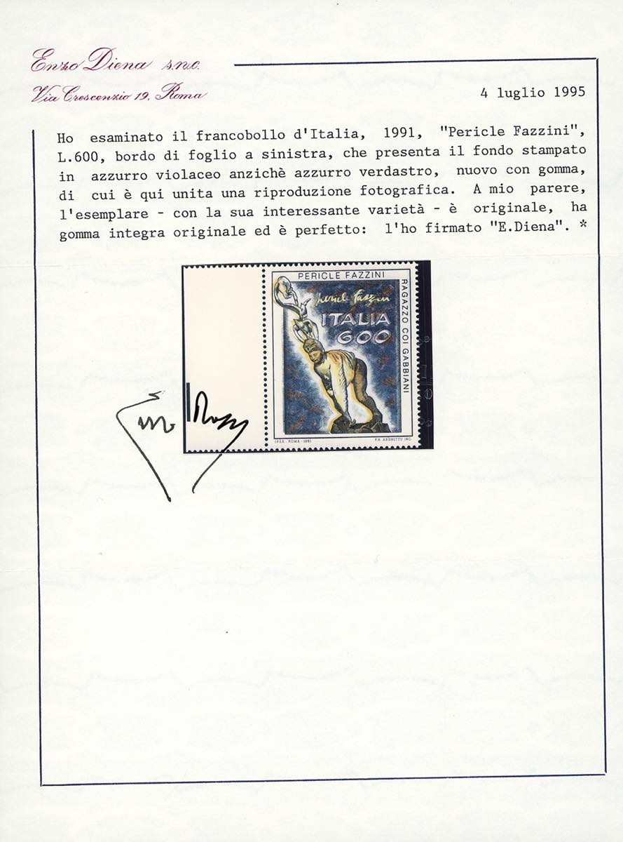 1991 - 600 lire Patrimonio artistico, francobollo naturale "Fazzini viola" (Bol. 2091B), bordo di foglio a sinistra, nuovo, gomma originale integra, perfetto. Splendido e molto raro, un solo foglio di 25 esemplari noto. Cert. finanziario Bolaffi 100% e cert. Enzo Diena.