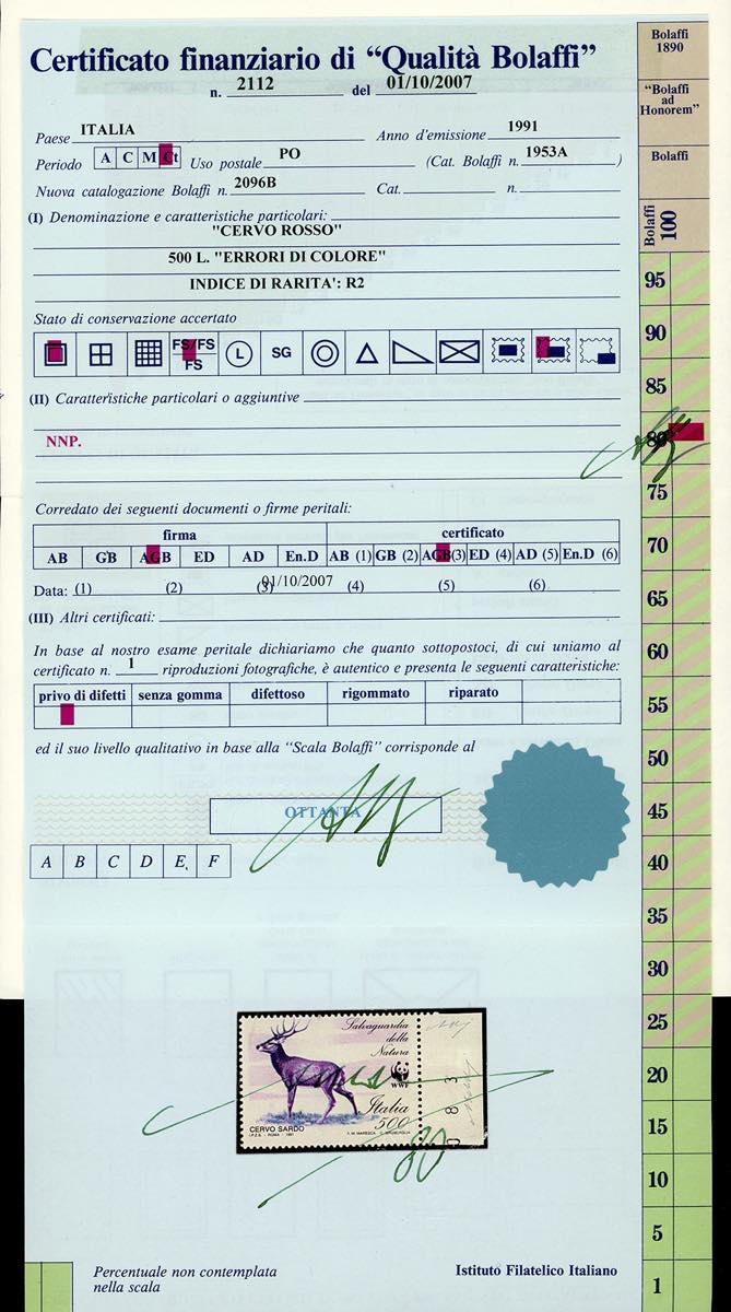 1991 - 500 lire Salvaguardia della natura, francobollo naturale "Cervo rosso" (Bol. 2096B), bordo di foglio a destra, nuovo, gomma originale integra, perfetto. Raro e di ottima qualità. Cert. finanziario Bolaffi 80%.