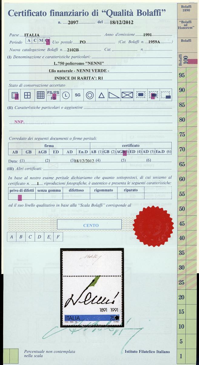 1991 - 750 lire Nenni, senza la stampa del rosso e con la stampa del verde fortemente spostata in alto, francobollo naturale "Nenni verde" (Sass. 1981e, Bol. 2102B), bordo di foglio in alto, nuovo, gomma originale integra, perfetto. Molto bello e raro, solo 50 esemplari noti. Firmato Raffaele Diena, cert. finanziario Bolaffi 100%.
