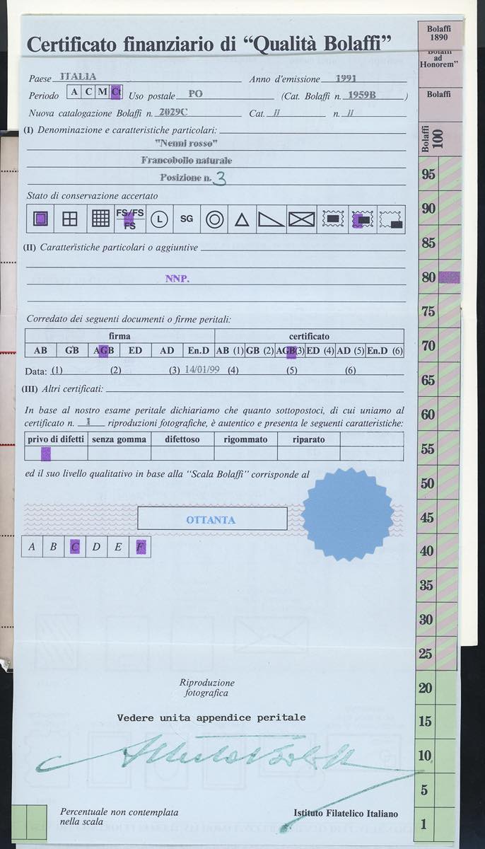 1991 - 750 lire Nenni, senza la stampa del verde, francobollo naturale "Nenni rosso" (Sass. 1981a, Bol. 2102C), bordo di foglio in alto, nuovo, gomma originale integra, perfetto e di ottima qualità. Molto raro, solo 25 esemplari noti. Cert. finanziario Bolaffi 80%.