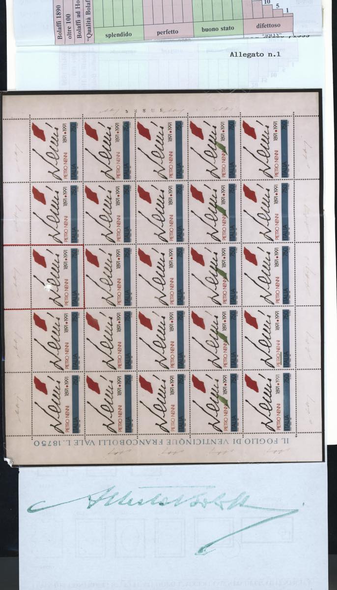 1991 - 750 lire Nenni, senza la stampa del verde, francobollo naturale "Nenni rosso" (Sass. 1981a, Bol. 2102C), bordo di foglio in alto, ... Leggi tutto
