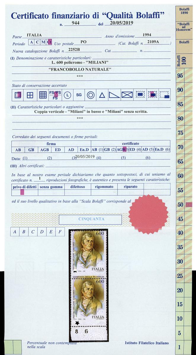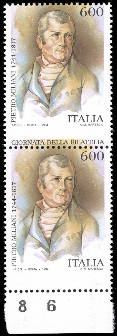 1994 - 600 lire Giornata della Filatelia, dentellatura orizzontale fortemente spostata in basso, coppia verticale, il primo esemplare con scritta in basso, il secondo senza scritta perché proveniente dall'ultima riga del foglio, bordo di foglio in basso, francobolli naturali "Milani in basso" e "Milani senza scritta" (Bol. 2252B,2252C), nuova, gomma originale integra, perfetta e bellissima. Rara. Cert. finanziario Bolaffi.