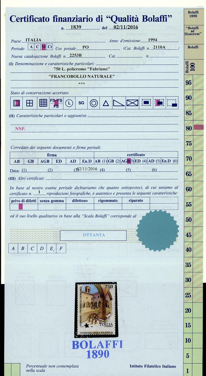 1994 - 750 lire Giornata della Filatelia, dentellatura orizzontale fortemente spostata in basso, francobollo naturale "Fabriano in basso" (Bol. 2253B), nuovo, gomma originale integra, perfetto e di ottima qualità. Cert. finanziario Bolaffi 80%.