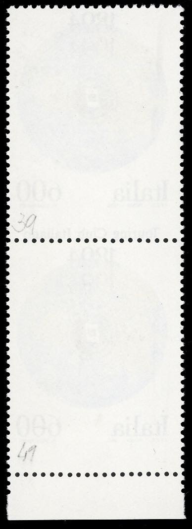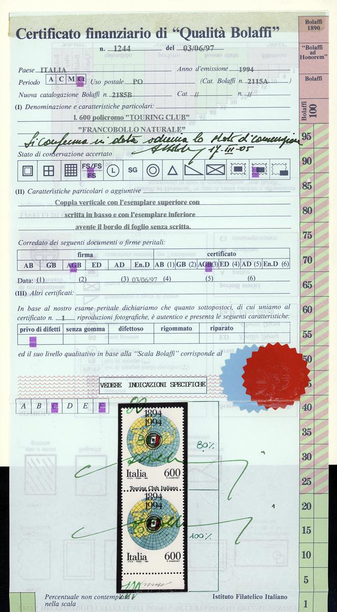 1994 - 600 lire Touring Club Italiano, dentellatura orizzontale fortemente spostata in basso, coppia verticale, il primo esemplare con scritta in basso, il secondo senza scritta perché proveniente dall'ultima riga del foglio, bordo di foglio in basso, francobolli naturali "Touring in basso" e "Touring senza scritta" (Sass. 2131a,2131b, Bol. 2258B,2258C), nuova, gomma originale integra, perfetta. Molto bella e rara. Cert. finanziario Bolaffi 80/100%.