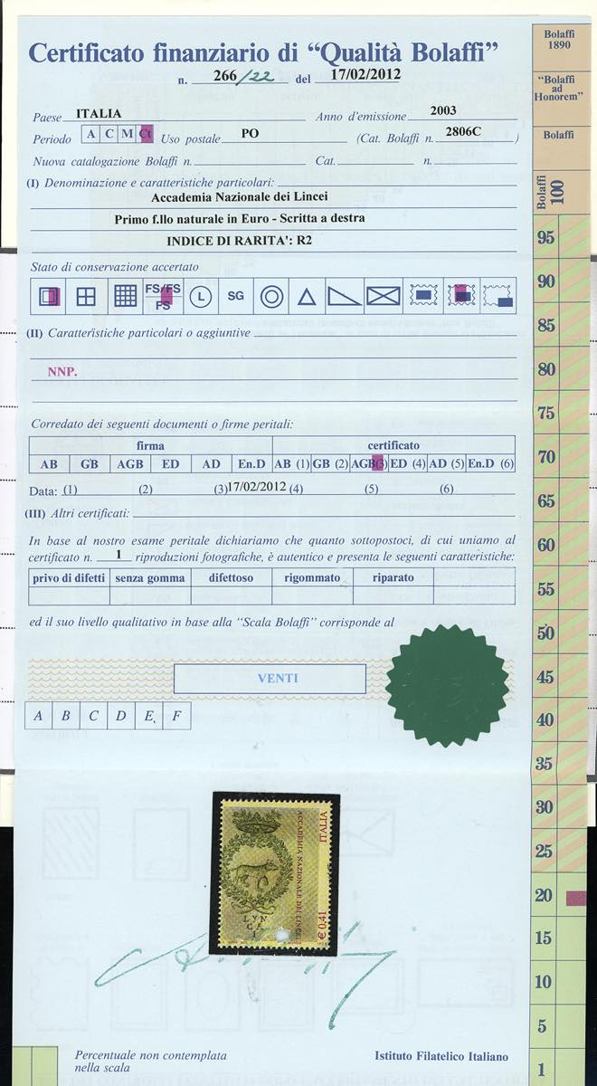 2003 - 0,41 € Lincei, stampa del rosso e del centro fortemente spostate a sinistra e dentellatura verticale fortemente spostata a destra, francobollo naturale "scritta a destra" (Sass. 2678c, Bol. 2806c), nuovo, gomma originale integra, perfetto. Cert. finanziario Bolaffi.