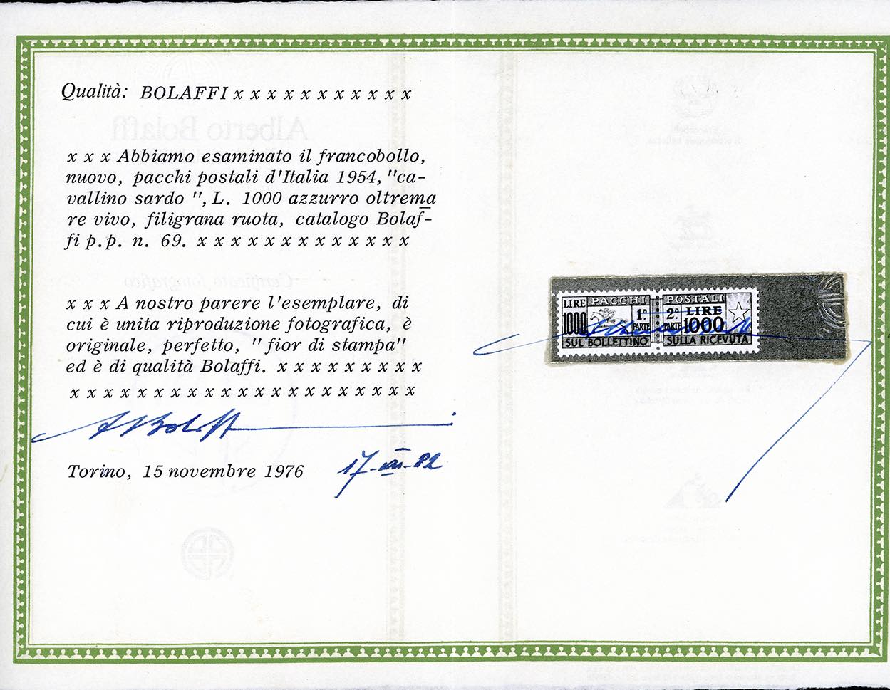 1954 - 1.000 lire Cavallino, filigrana ruota (81), buona/ottima centratura, nuovo, gomma originale integra, perfetto e molto fresco. Cert. Bottacchi.