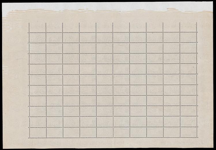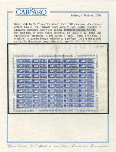 1954 - 1.000 lire oltremare Cavallino, dent. 13 1/4 a pettine, filigrana ruota (81), foglio di 50 esemplari completo dei margini integrali di foglio, nuovo, gomma originale integra, perfetto. Splendido.