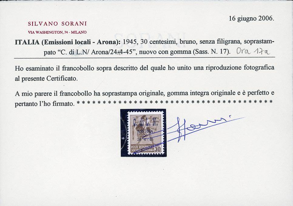 ARONA 1945 - 30 cent. Monumenti distrutti soprastampato, senza filigrana, senza trattino tra "24" e "4", pos. 7 (17a), nuovo, gomma originale integra, perfetto. Rarissimo, due soli esemplari noti. Raybaudi, cert. Sorani.