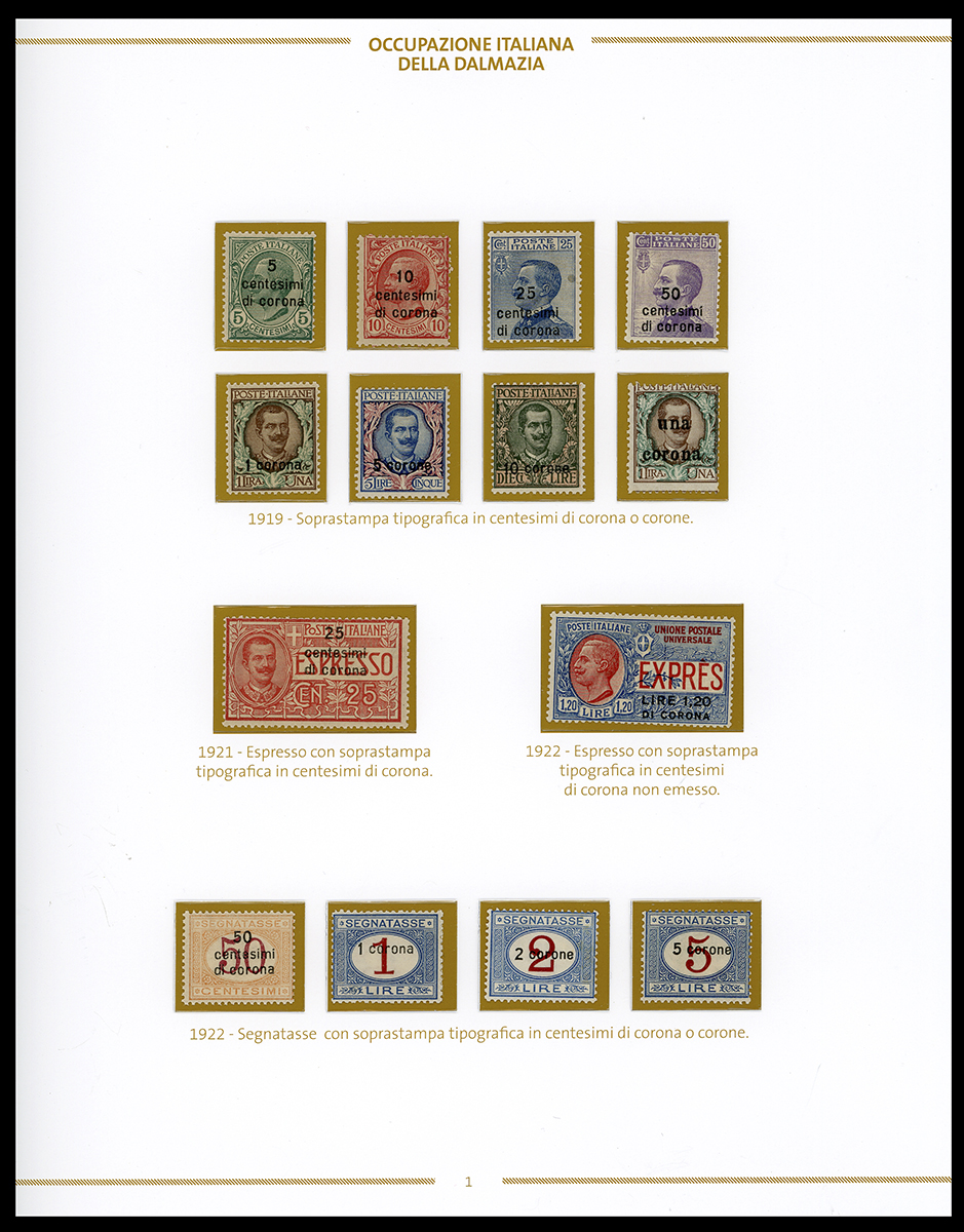 DALMAZIA 1919/22 - Tutti i francobolli e i servizi soprastampati del periodo, nuovi, gomma originale integra, perfetti, in pagina d'album Bolaffi. Ottima qualità.