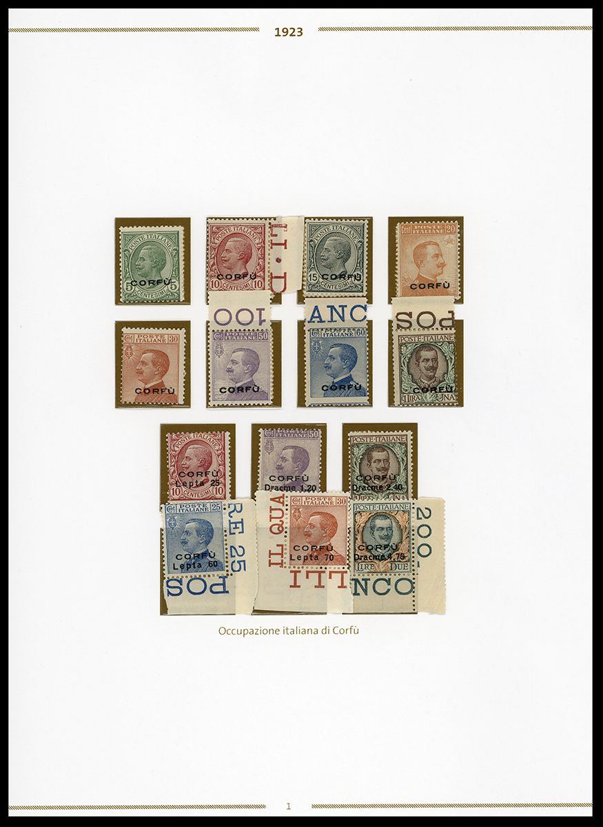CORFU' 1923 - Le tre emissioni soprastampate, serie complete (1/8,9/11,12/14), nuovi, gomma originale integra, perfetti, in fogli d'album Bolaffi.