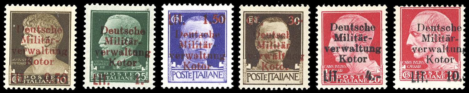 OCCUPAZIONE TEDESCA CATTARO 1944 - Prima emissione, soprastampati, serie completa (1/6), nuovi, gomma originale integra, perfetti. Cert. Ferrario.