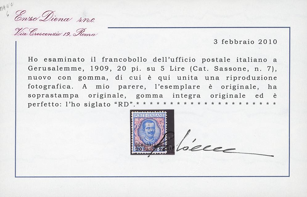GERUSALEMME 1909/11 - Soprastampati, serie completa (1/8), nuovi, gomma originale integra, perfetti e di ottima qualità. Cert. Diena per il raro n. 7.