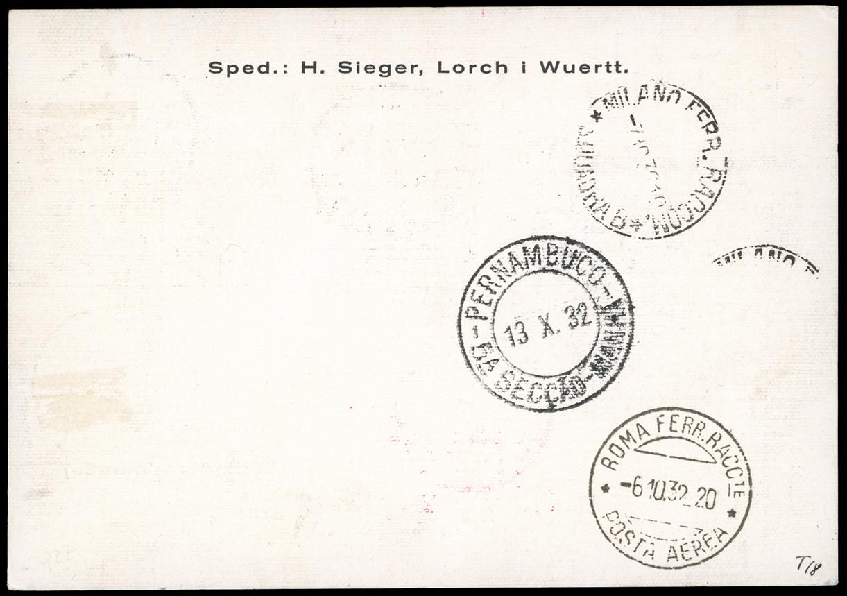 POSTA AEREA 1932 - 1 lira, 3 lire e 5 lire Dante, posta aerea, Emissioni Generali e 1 lira posta aerea di Tripolitania (A9,A10,A11,Trip.A13), perfetti, su cartolina raccomandata via aerea, viaggiata con il Graf Zeppelin, 8°Sudamerikafahrt, da Tripoli 5/10/1932 a Recife in Brasile, bolli speciali, di transito e arrivo. Bella e non comune. Cert. Ferrario.