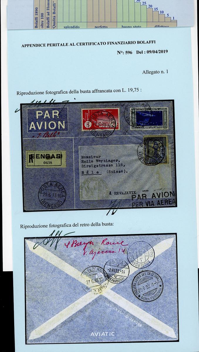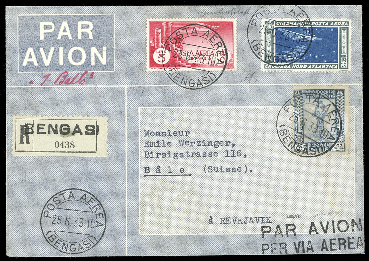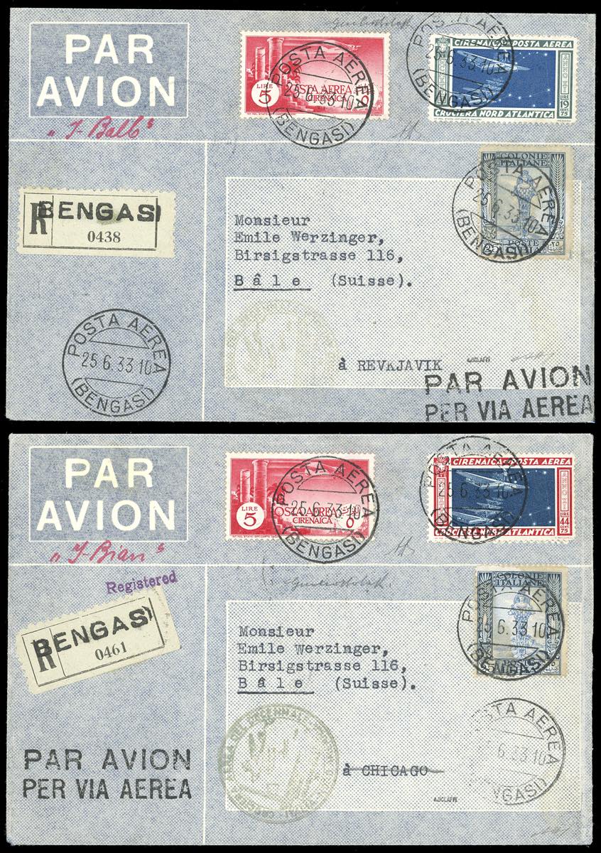 POSTA AEREA 1933 - Crociera Nord Atlantica di Balbo, la serie completa (A18/A19), con valori complementari, su due aerogrammi raccomandati da Bengasi 25/6/1933, uno diretto a Reykjavik, trasportato sull'I-BALB, l'altro diretto a Chicago, trasportato sull'I-BIAN, bolli speciali e d'arrivo. Molto belli e rari. Firmati Alberto Diena e Giulio Bolaffi. Cert. finanziario Bolaffi.