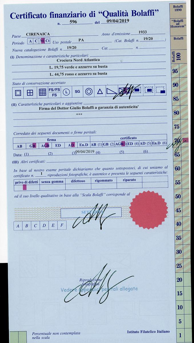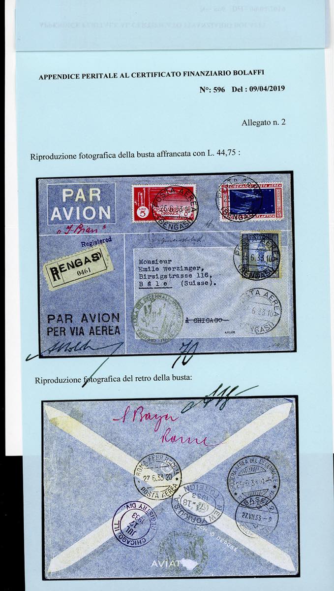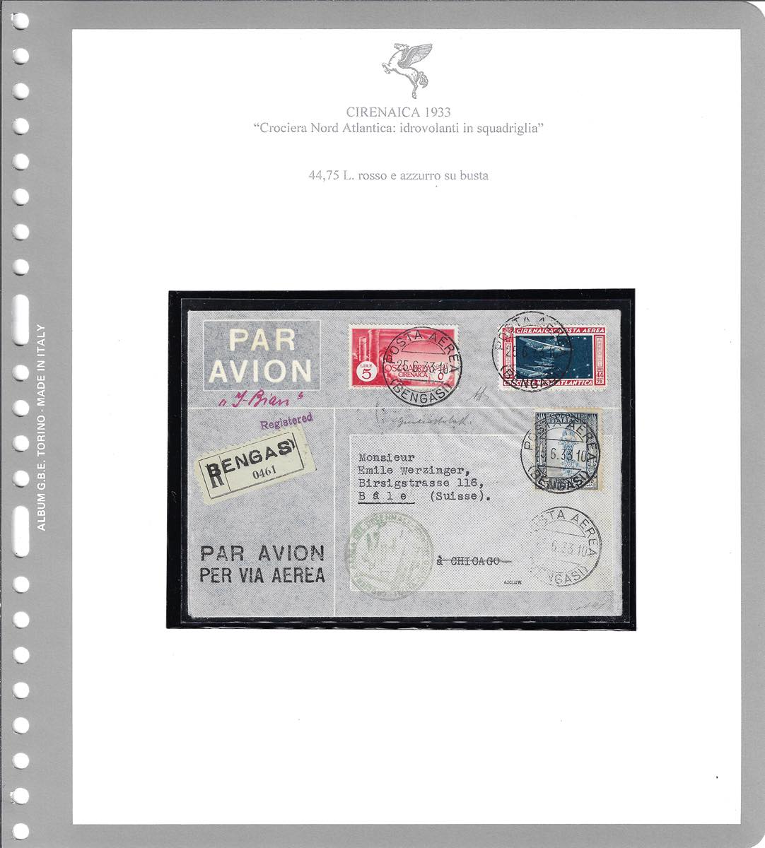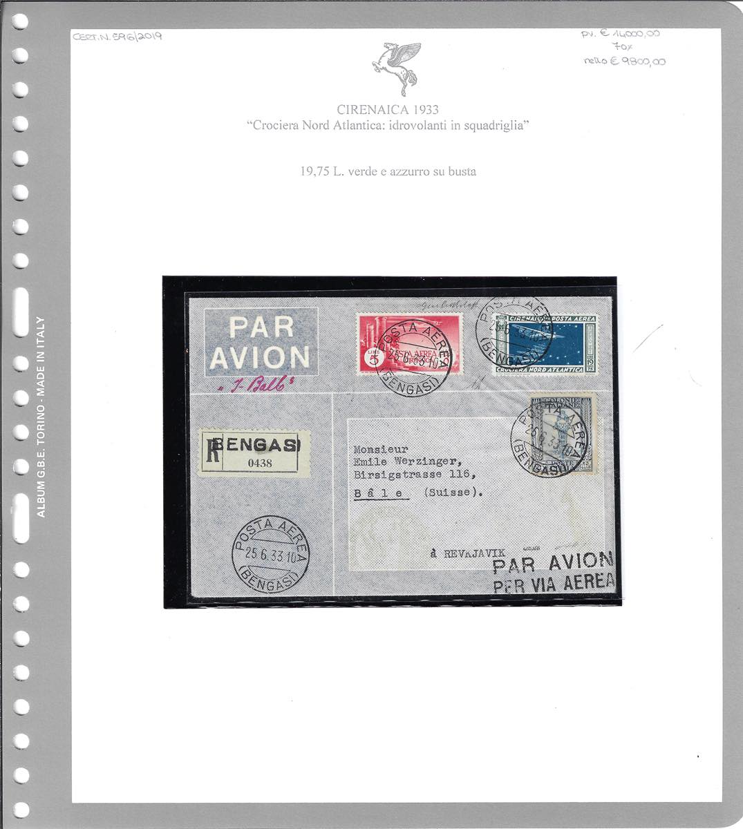 POSTA AEREA 1933 - Crociera Nord Atlantica di Balbo, la serie completa (A18/A19), con valori complementari, su due aerogrammi raccomandati da Bengasi 25/6/1933, uno diretto a Reykjavik, trasportato sull'I-BALB, l'altro diretto a Chicago, trasportato sull'I-BIAN, bolli speciali e d'arrivo. Molto belli e rari. Firmati Alberto Diena e Giulio Bolaffi. Cert. finanziario Bolaffi.