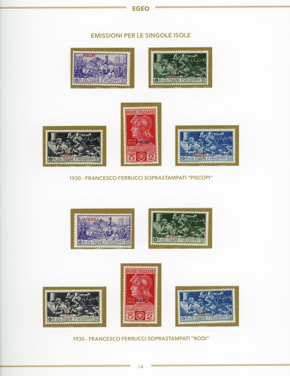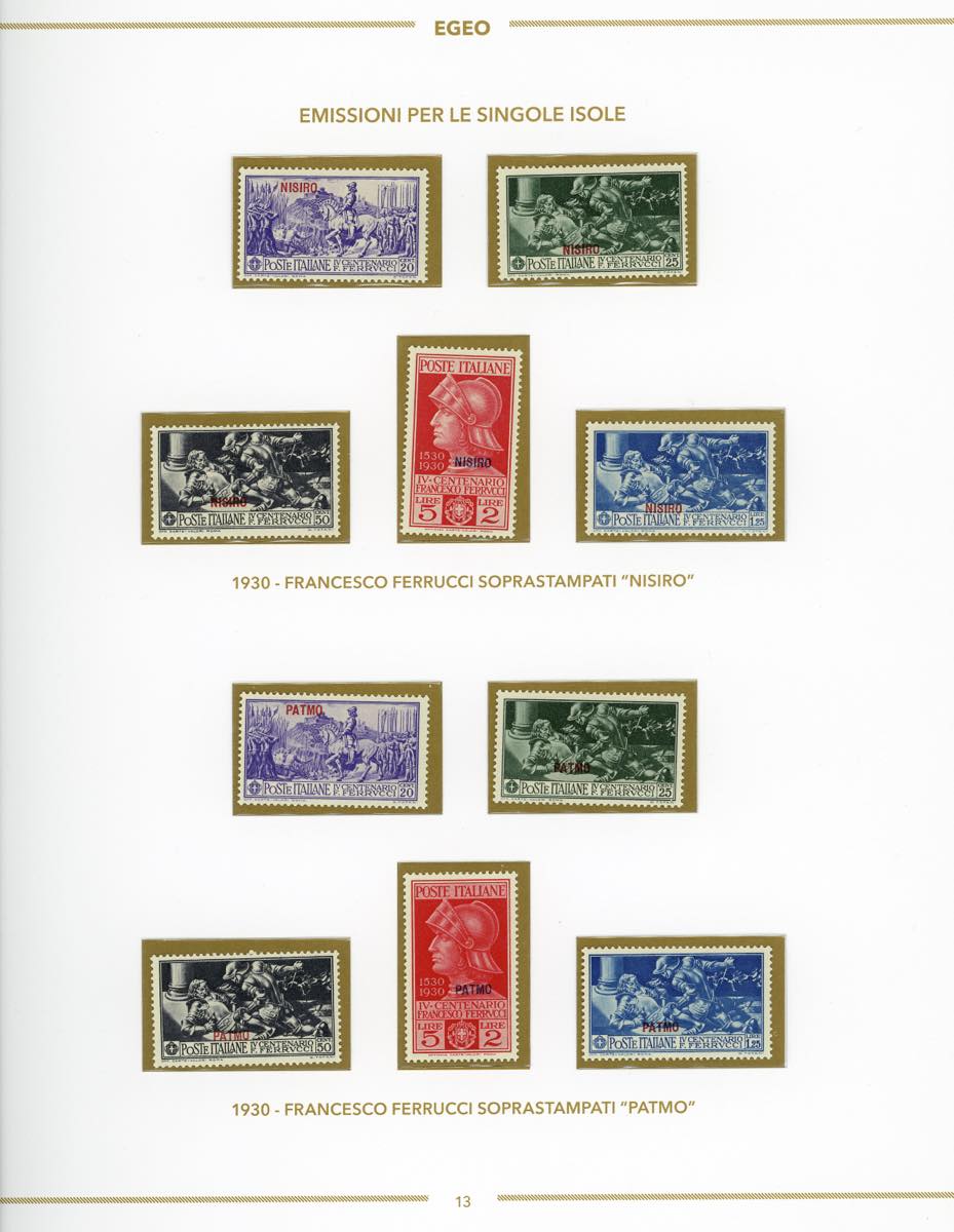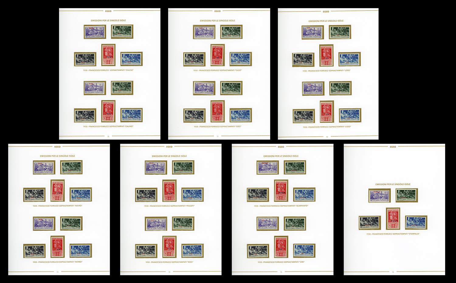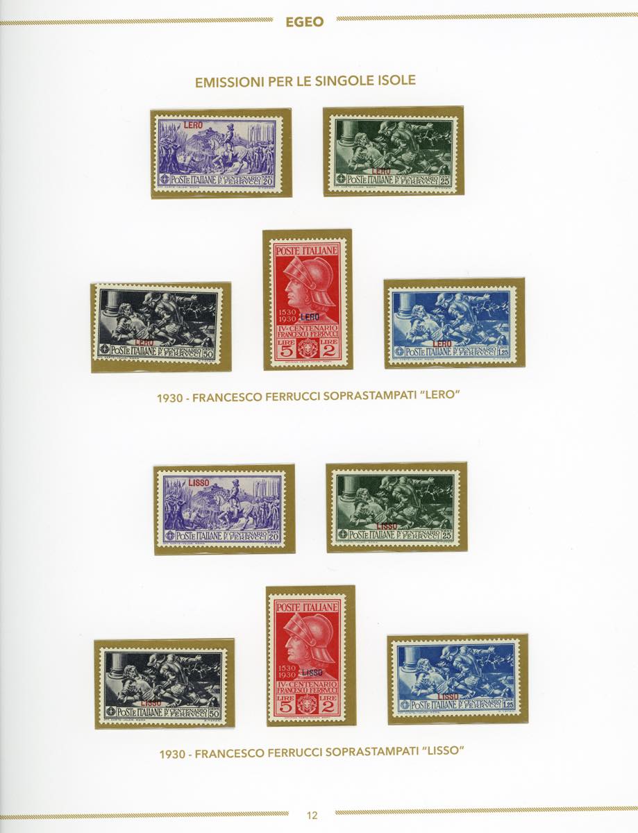 GIRI ISOLE 1930 - Ferrucci, serie completa (12/16, Rodi 15/19), giro delle 13 isole, nuovi, gomma originale integra, perfetti, montati su fogli d'album Bolaffi. Ottima qualità.