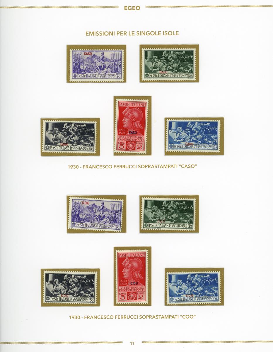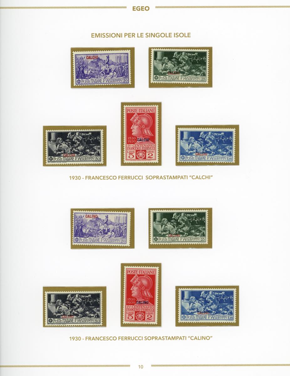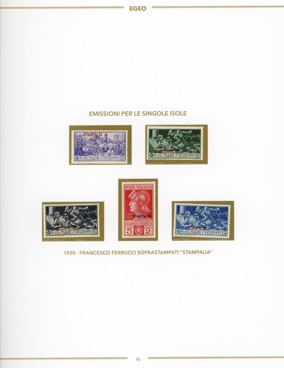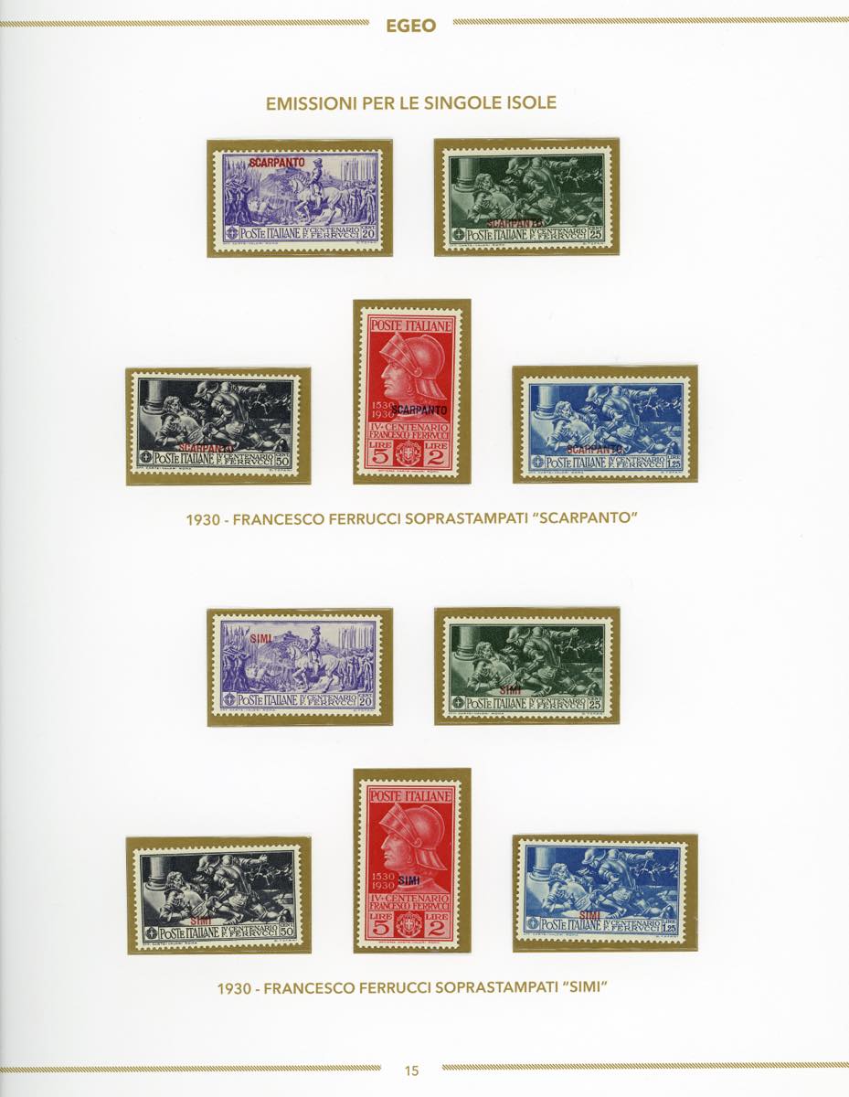 GIRI ISOLE 1930 - Ferrucci, serie completa (12/16, Rodi 15/19), giro delle 13 isole, nuovi, gomma originale integra, perfetti, montati su fogli d'album Bolaffi. Ottima qualità.