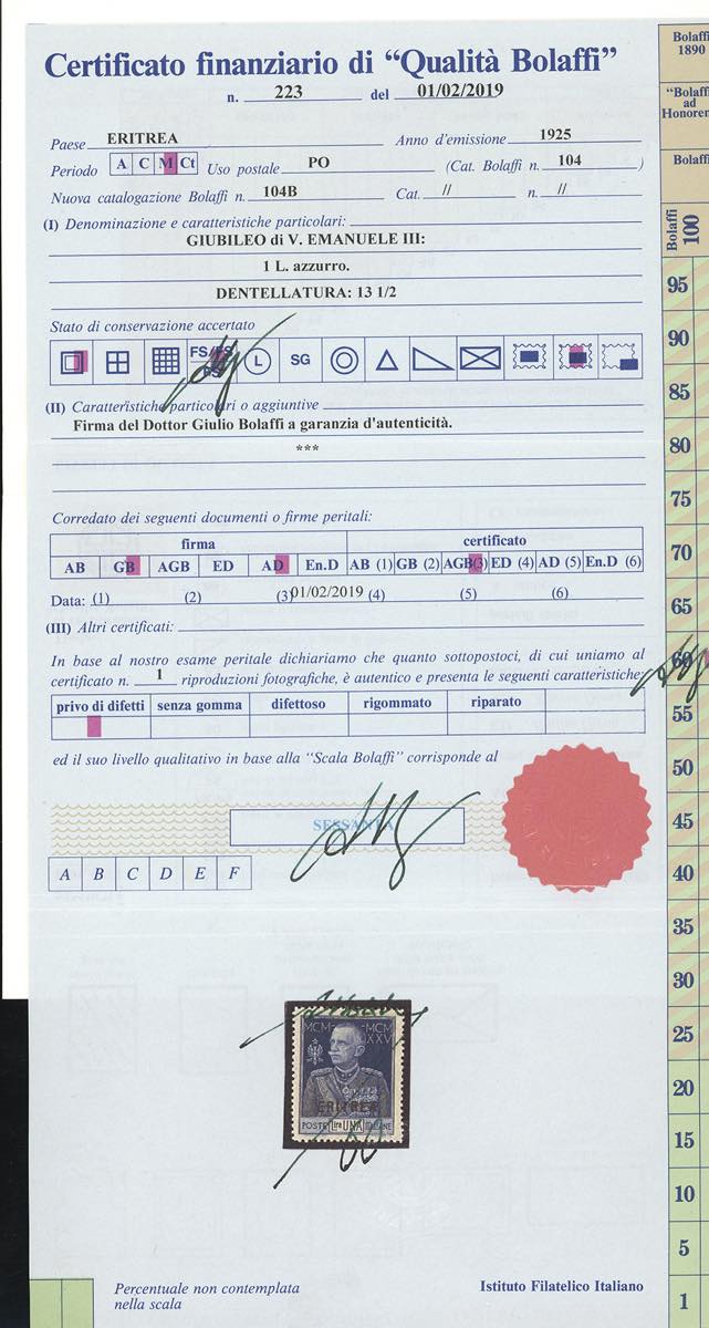 1925 - 1 lira Giubileo, dent. 13 1/2 (100), nuovo, gomma originale integra, perfetto e ben centrato. Molto raro di questa qualità. Firmato per esteso Alberto Diena e Giulio Bolaffi e cert. finanziario Bolaffi.