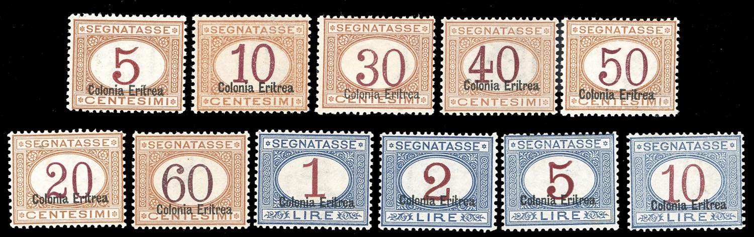 SEGNATASSE 1920/26 - Soprastampati "Colonia Eritrea" in basso, serie completa (14/24), nuovi, gomma originale integra, perfetti e molto ... Leggi tutto
