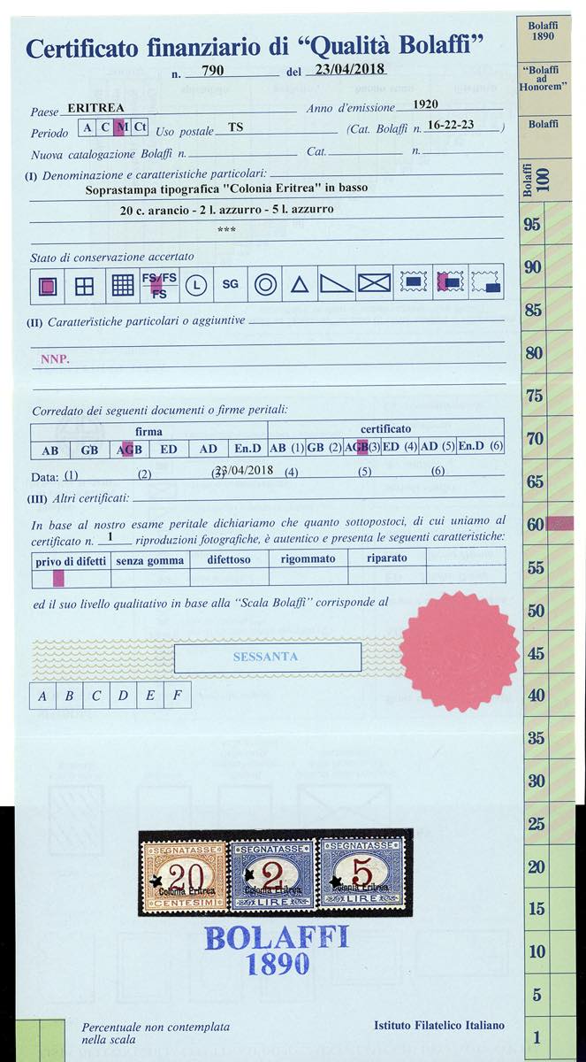 SEGNATASSE 1920/26 - Soprastampati "Colonia Eritrea" in basso, serie completa (14/24), nuovi, gomma originale integra, perfetti e molto freschi. Splendida qualità. Il raro 2 lire è firmato G.Bolaffi ed A.Diena, cert. finanziario Bolaffi per i n. 16, 22 e 23.