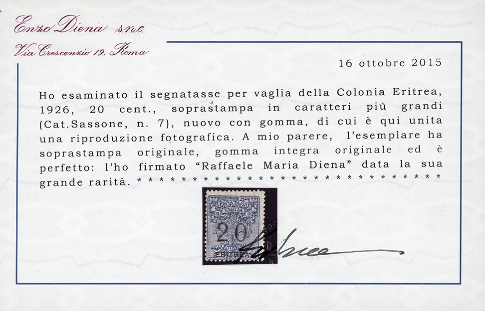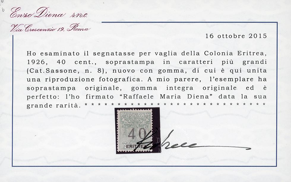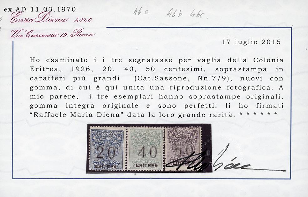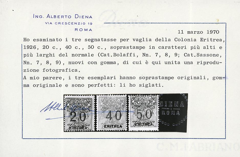 Cert. Alberto Diena per la serie e Raffaele Diena sia per la serie e che per i singoli esemplari.