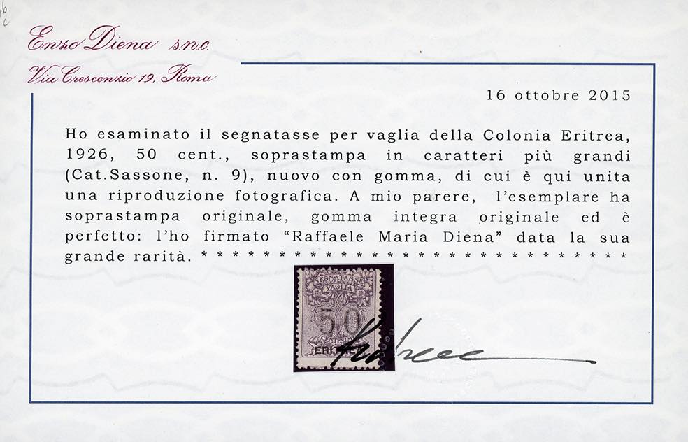 Eccezionale e grandissima rarità delle Colonie Italiane, pochissimi esemplari noti, tutti con questa centratura.
