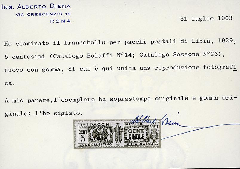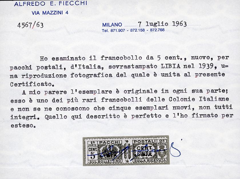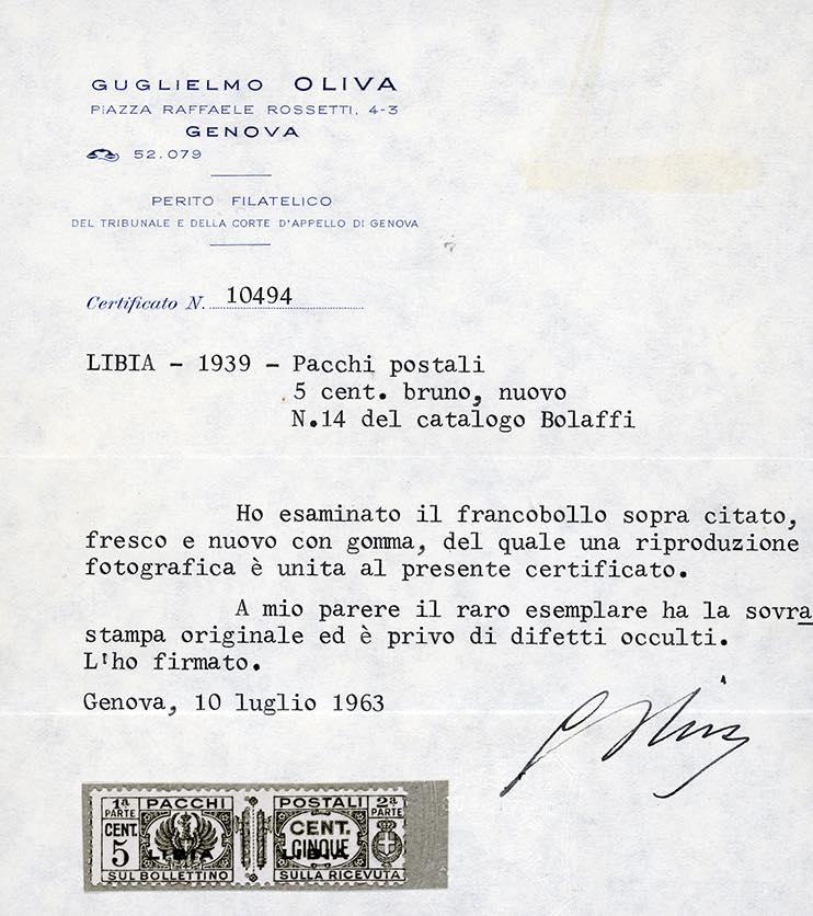 PACCHI POSTALI 1939 - 5 cent. bruno, fasci al centro, soprastampato (26), nuovo, gomma originale integra, perfetto. Splendido ed estremamente raro, una trentina di esemplari noti (di cui alcuni difettosi), tutti con la stessa centratura. Firmato Giulio Bolaffi (per esteso), cert. G.Oliva, A.Diena, Fiecchi e Sorani.