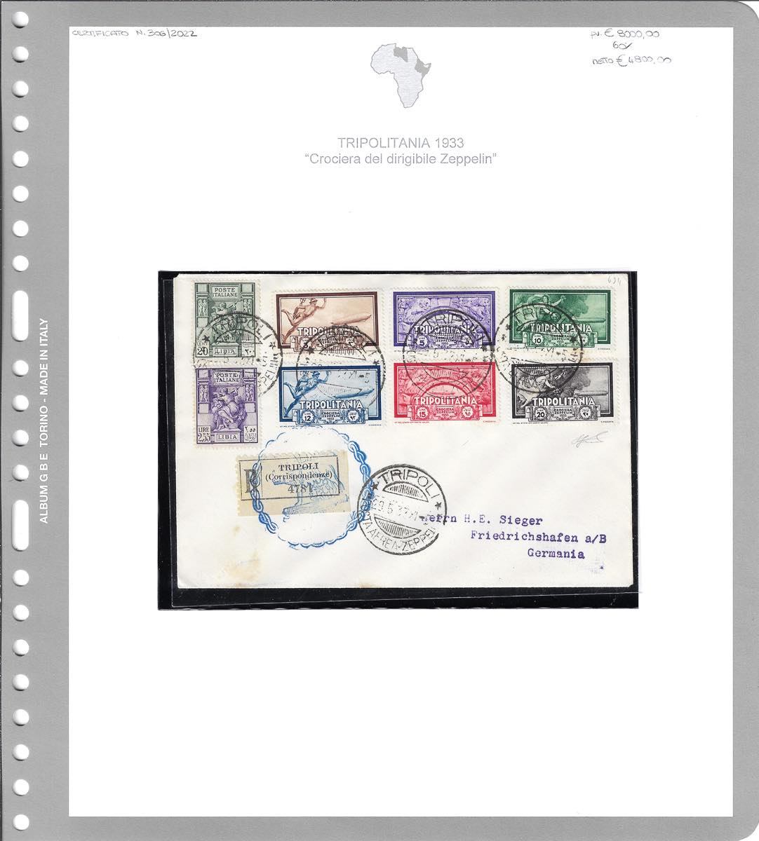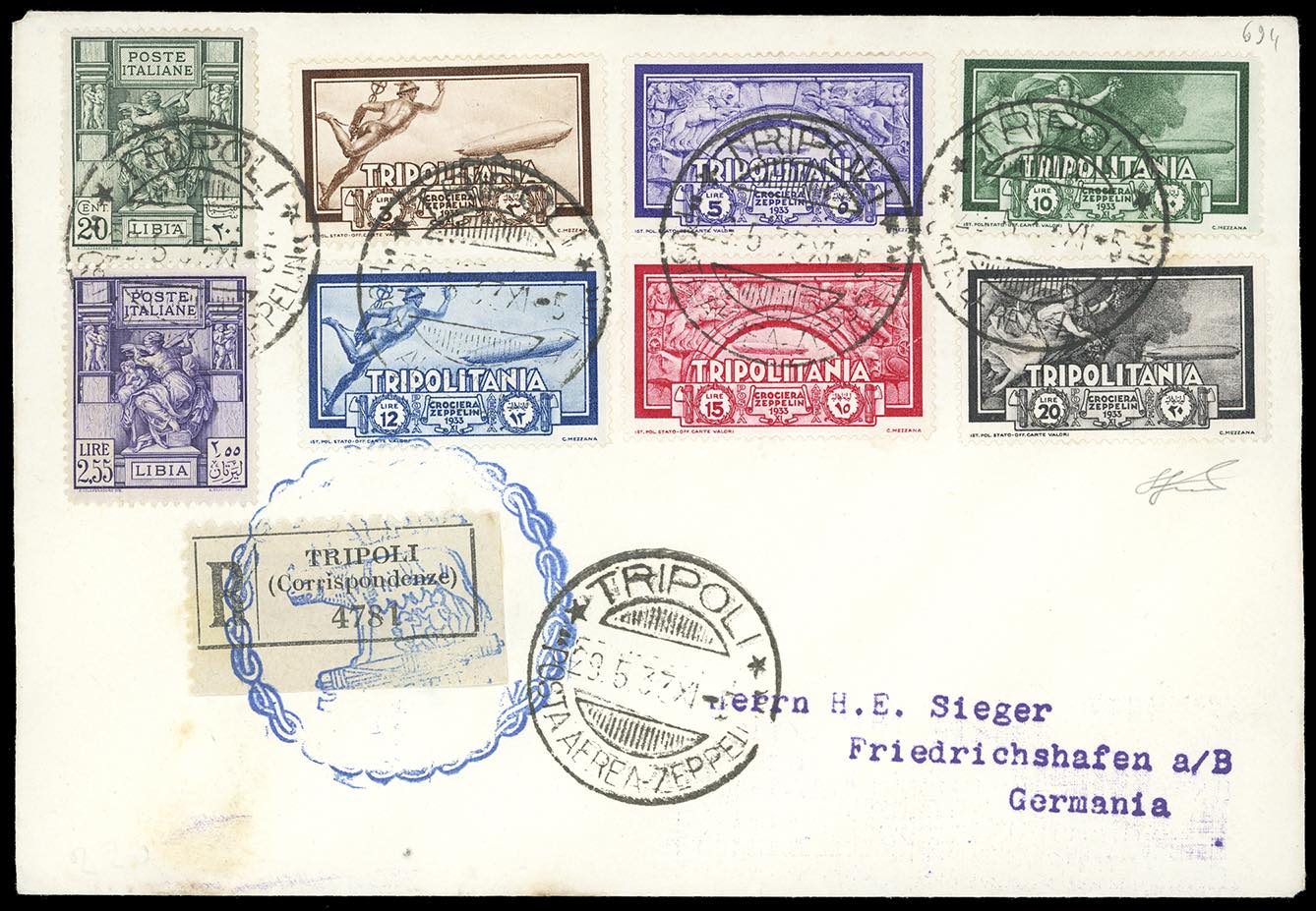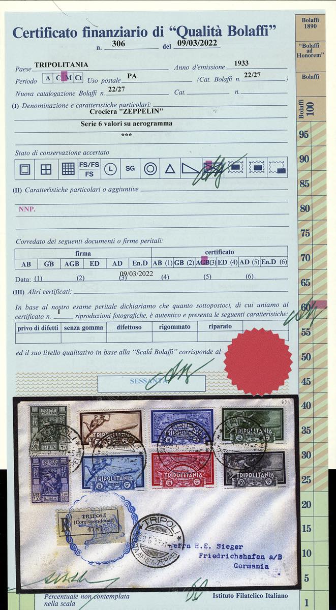 POSTA AEREA 1933 - Crociera Zeppelin, serie completa con valori complementari (A22/A27), perfetti, su aerogramma, viaggiato con il Graf Zeppelin, da Tripoli 29/5/1933 a Friedrichshafen, bolli speciali e d'arrivo. Bellissimo. Ferrario, cert. finanziario Bolaffi.