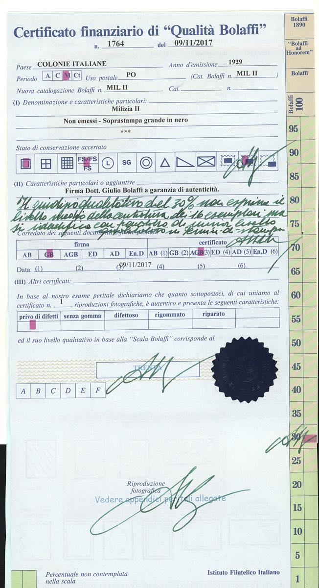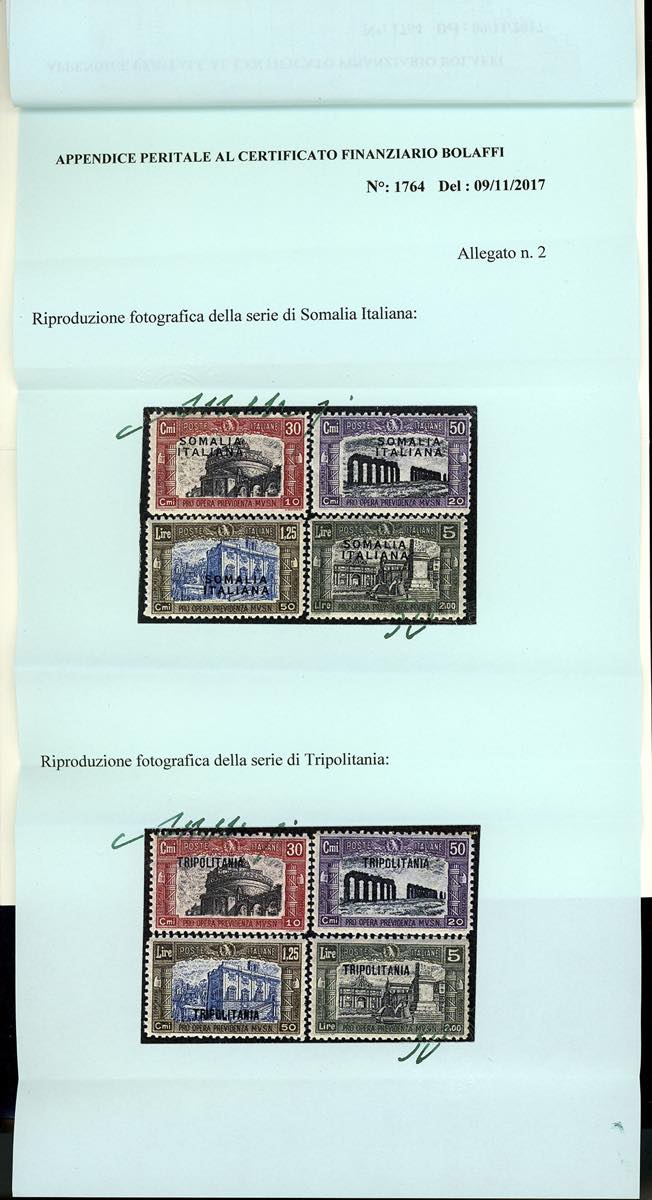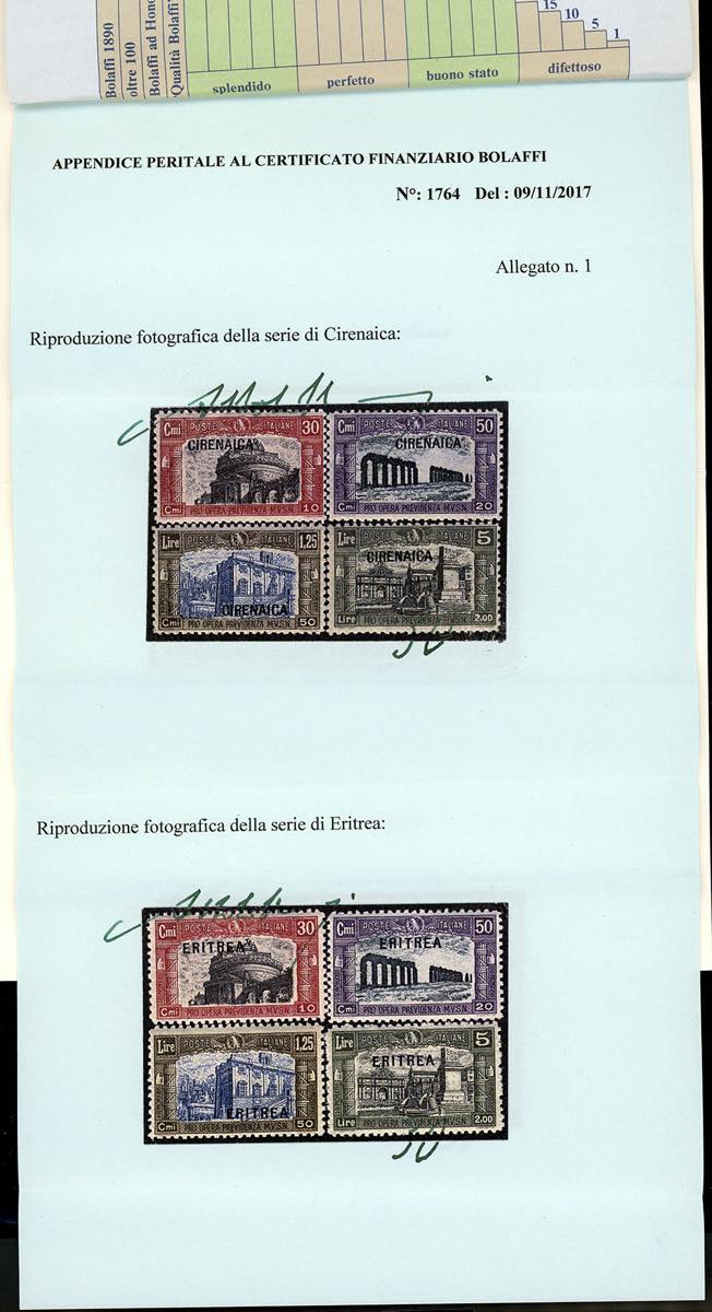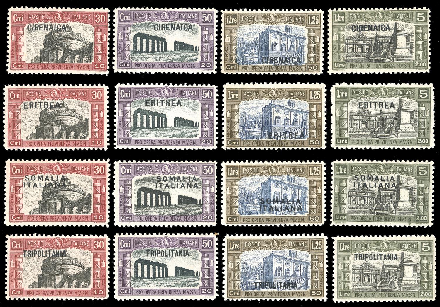 1929 - MILIZIA II EMISSIONE, COLORI CAMBIATI, soprastampa più grande usata per la prima emissione, le quattro serie complete di Cirenaica, Eritrea, Somalia e Tripolitania, nuove, gomma originale integra, perfette.