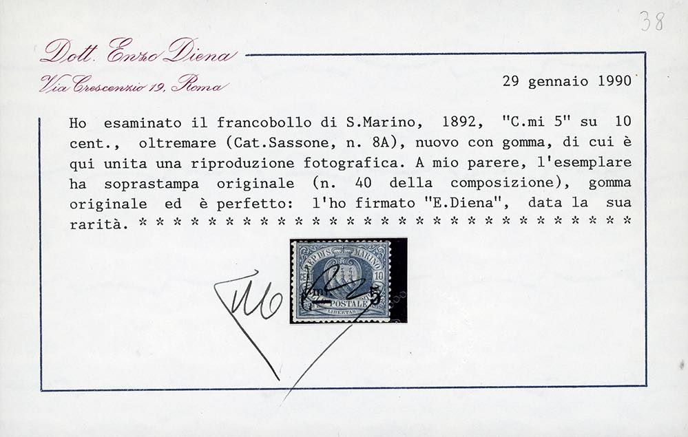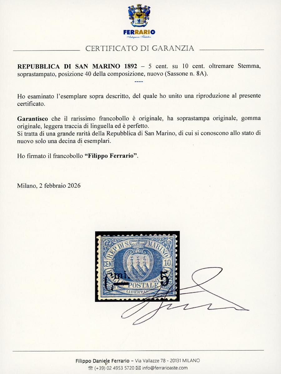1892 - 5 cent. su 10 cent. oltremare Stemma, soprastampato, posizione 40 della composizione (8A), nuovo, gomma originale, leggera traccia di linguella, perfetto. Rarità della Repubblica di San Marino, di cui si conoscono solo una decina di esemplari nuovi. Raybaudi, cert. Ferrario ed Enzo Diena 1990.