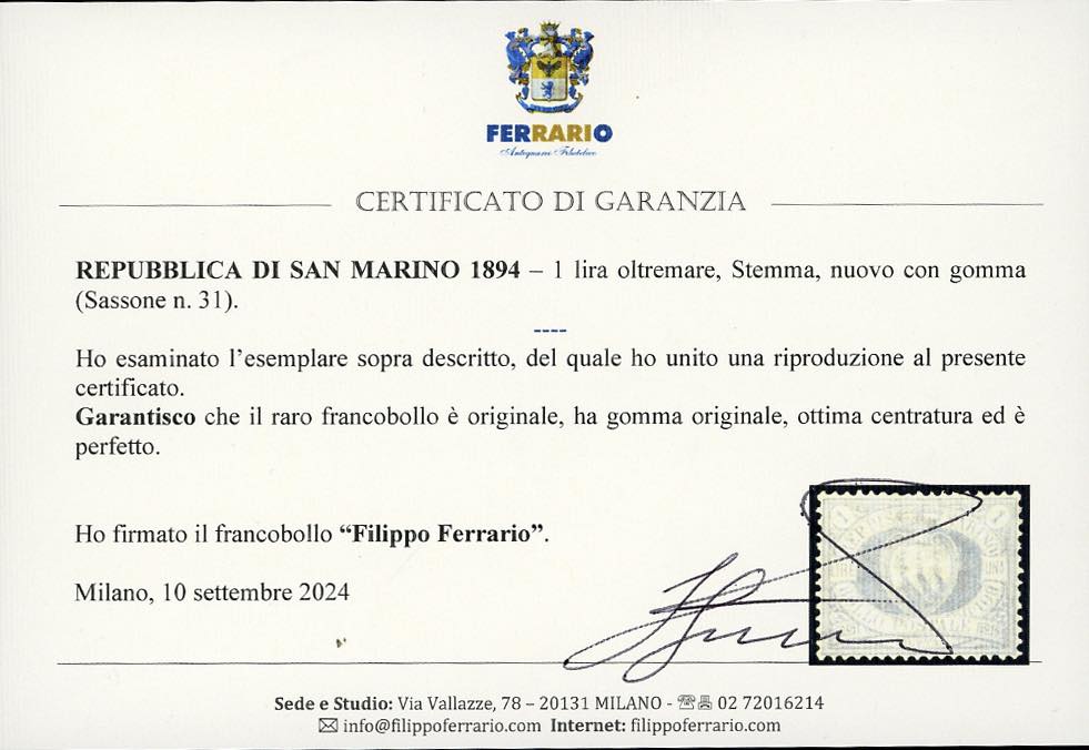 1894 - 1 lira oltremare, Stemma (31), nuovo, gomma originale integra, perfetto. Splendido e centratura eccezionale. Raro di questa qualità. Firmato Emilio Diena, cert. Ferrario e Oro Raybaudi.