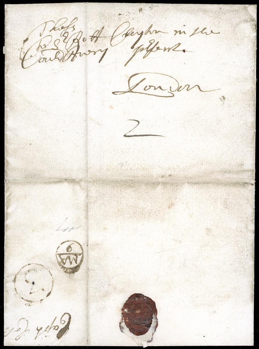 1688 - Lettera prefilatelica, senza testo interno, del maggio 1688 per Londra, dove vennero apposti in arrivo il bollo Bishop MA/9 e il bollo circolare contenente il numero 3, in uso tra il 1673 e il 1689 per identificare l'ufficio distributore della posta di Londra, entrambi in inchiostro brunastro. Pregevole esempio del primo bollo postale al mondo. Cert. "Parola scritta" Bolaffi.