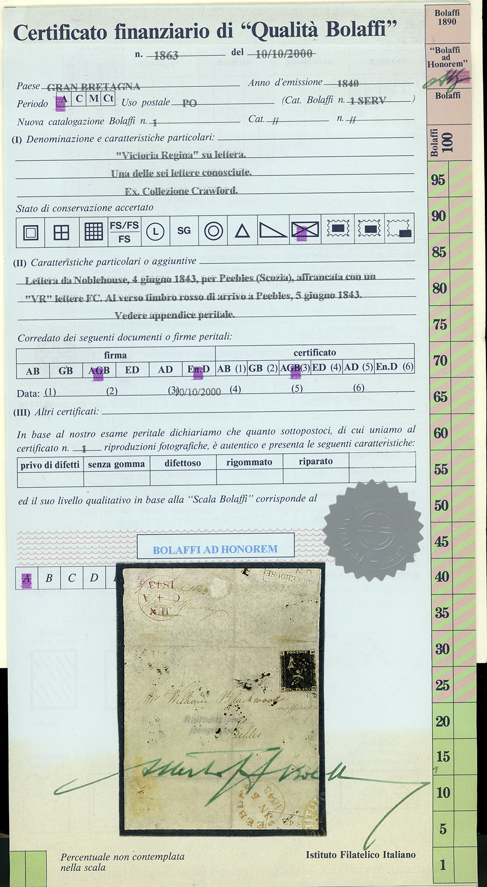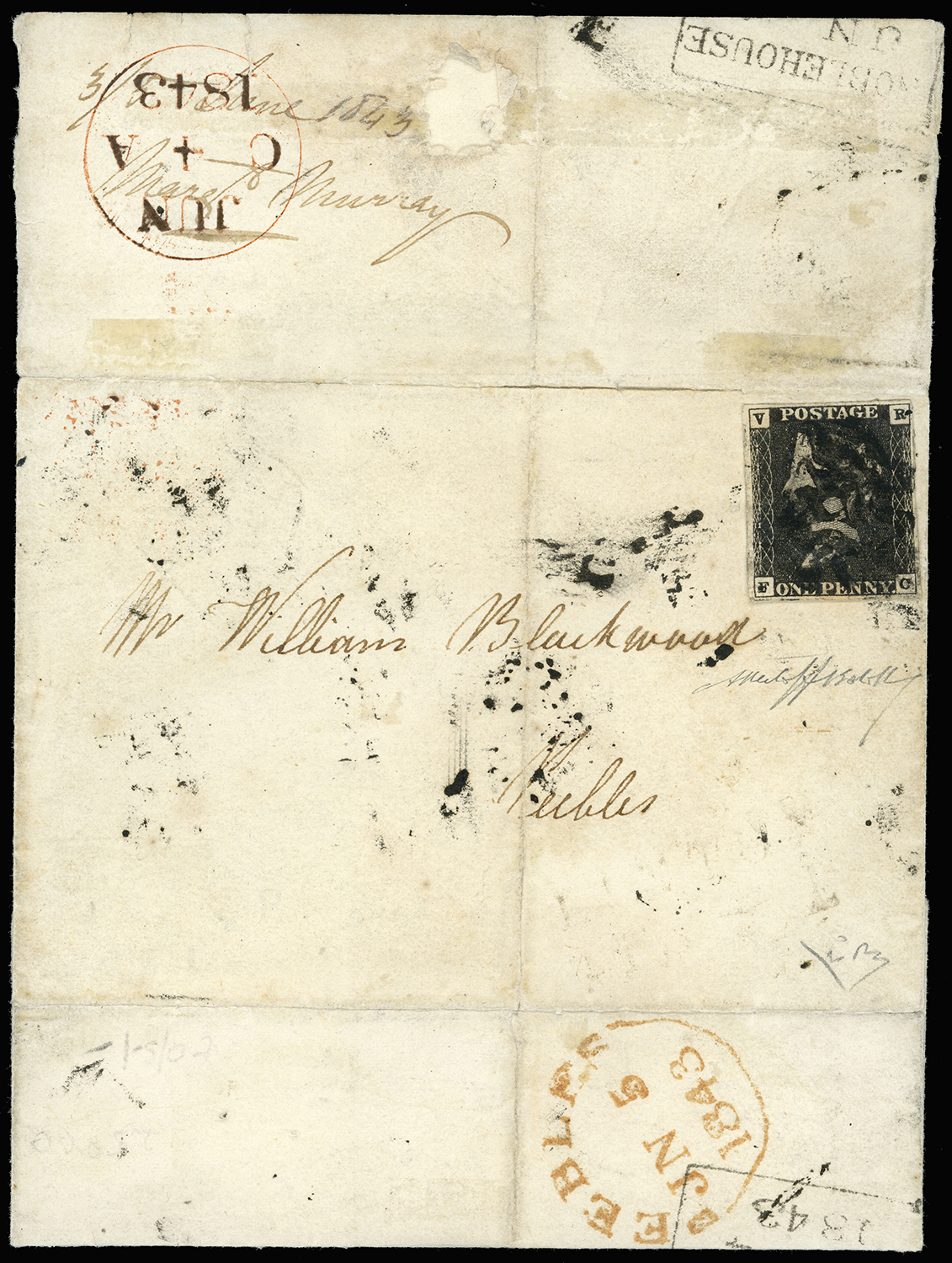 SERVIZIO 1840 - 1 penny nero, lettere VR negli angoli superiori, non emesso (1), lettere F-C in basso, perfetto, ampi margini, eccezionalmente usato su lettera da Noblehouse 4 giugno 1843 per Peebles, in Scozia, bollo d'arrivo del 5 giugno al verso.