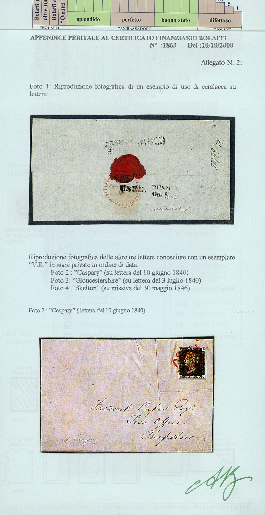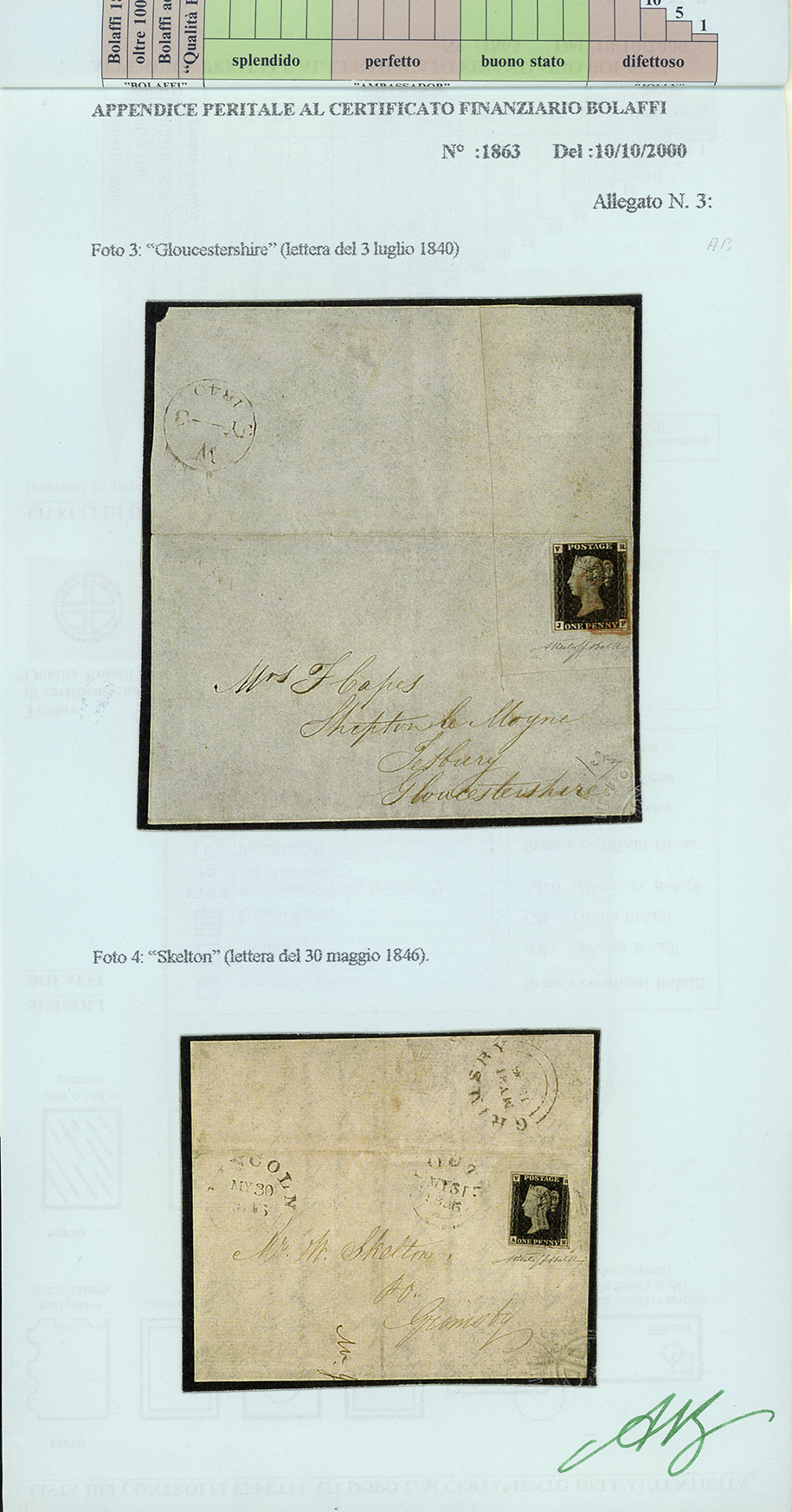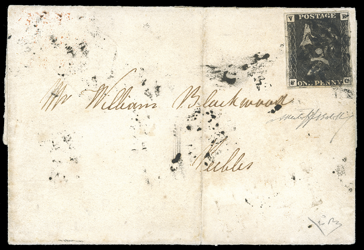 Su lettera si conoscono solo sei esemplari, uno nella collezione reale inglese, uno conservato alla British Library e quattro in mani private: i francobolli di due lettere furono ritagliati per creare due grandi frammenti e solo successivamente ricollocati nelle posizioni originarie; una ha il francobollo corto (lettera "Skelton"); questa offerta in asta può essere ritenuta qualitativamente la migliore disponibile.