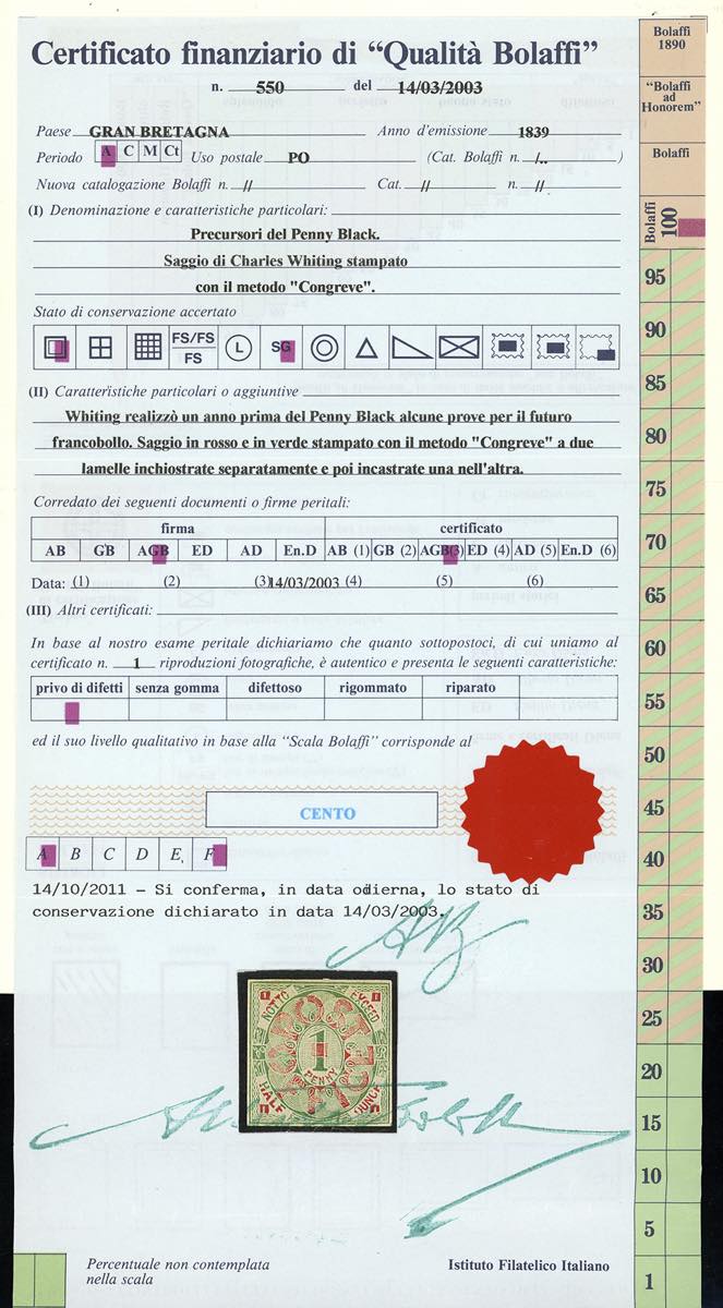 PROVE 1839 - 1 penny rosso e verde, saggio di Charles Whiting, stampato con il metodo "Congreve", senza gomma, perfetto. Bello e raro. Cert. finanziario Bolaffi.