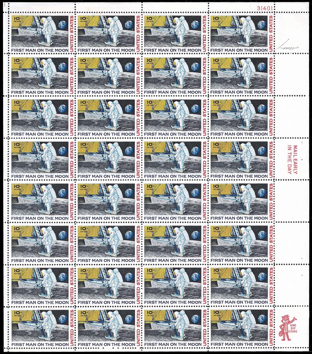 STATI UNITI D'AMERICA 1969 - 10 cent. First man on the Moon (Unif. A76), foglio completo di 32 esemplari, due (in posiz. 4 e 7) con ... Leggi tutto