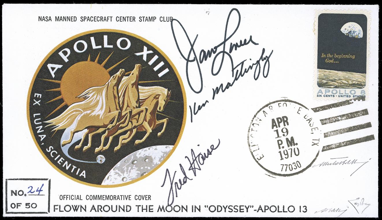 Si tratta di una delle 50 buste (numero 24 di 50) trasportate nello spazio per 5 giorni e 22 ore dalla sfortunata e celebre missione “Apollo 13”, che per un guasto tecnico non riuscì ad allunare e rientrò, con diverse diffcoltà, sulla Terra.