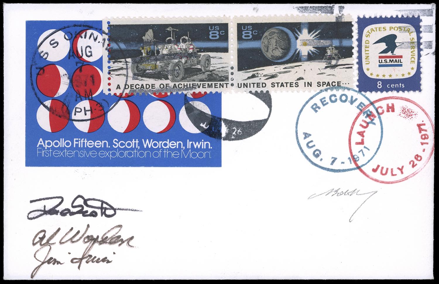 STATI UNITI D'AMERICA 1971 - APOLLO 15 - Il cosmogramma, uno dei pochi autorizzati e trasportati con l'Apollo XV nell'orbita lunare. Reca i bolli "Launch July 26 1971", "Recover Aug. 7 1971" e i francobolli, perfetti, sono annullati "U.S.S. Okinawa 7/8/1971". Sono presenti le firme dei tre astronauti: Scott, Worden e Irwin. Raro, splendida qualità. Cert. finanziario Bolaffi 100%.