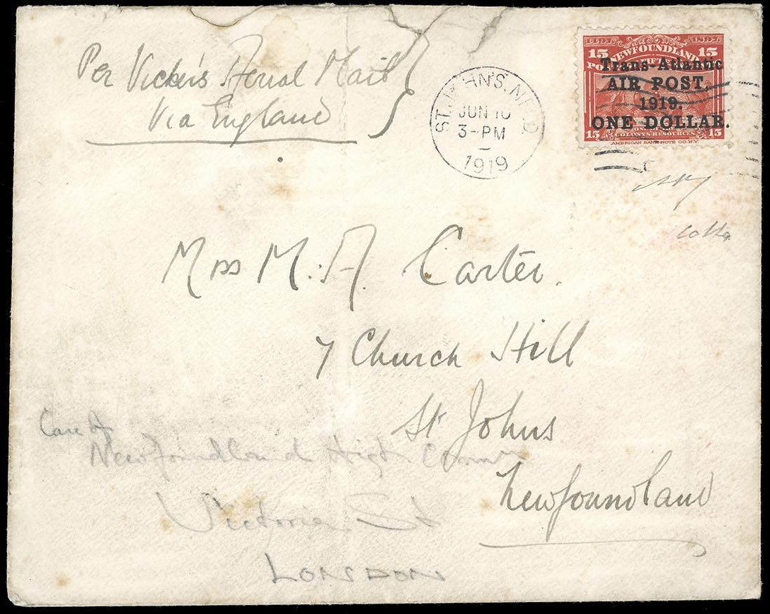 TERRANOVA-NEWFOUNDLAND-POSTA AEREA 1919 - 1 $. su 15 cent. volo attraverso l'Atlantico del Cap. Alcock (Yv.A2), perfetto, su aerogramma da St.Johns 10/6/1919 a Londra e rispedito al mittente. Prima traversata atlantica non-stop da Terranova all'Irlanda. Solo 197 aerogrammi trasportati. G.Colla, cert. finanziario Bolaffi.