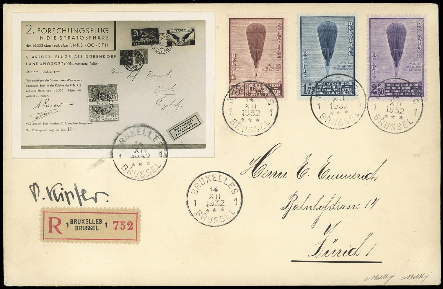 BELGIO 1932 - Volo Piccard, serie completa (353/355), perfetti, su busta raccomandata celebrativa dell'impresa del Prof. Piccard, volo nella stratosfera, da Bruxelles 14/12/1932 a Zurigo, con fotoriproduzione dell'aerogramma e firma dell'assistente Kipfer. Firmata Alberto Bolaffi.