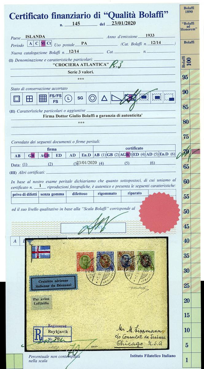 Soprastampati per la Crociera Nord Atlantica d Balbo, serie completa, con valore complementare (A12/A14), perfetti, su fresco aerogramma raccomandato da Reykjavik 7/7/1933 a Chicago, negli Stati Uniti, con bollo d'arrivo al verso.