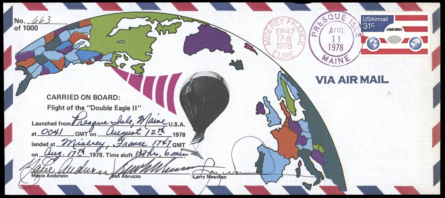 STATI UNITI D'AMERICA POSTA AEREA 1978 - DUOBLE EAGLE II, primo volo transatlantico con pallone aerostatico, l'aerogramma speciale del volo, n. 663 di 1.000 trasportati, con firme autografe di Anderson, Abruzzo e Newman. Splendido. Cert. Finanziario Bolaffi 100%.