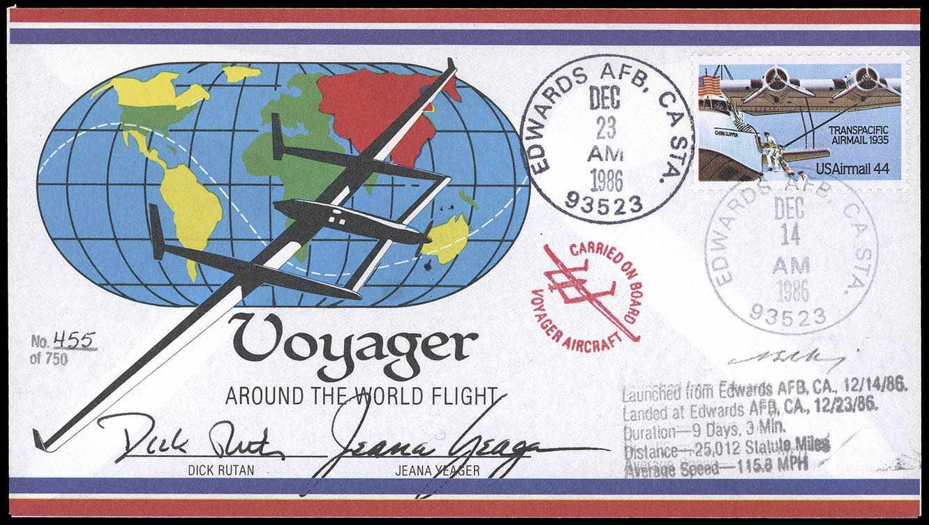 STATI UNITI D'AMERICA POSTA AEREA 1986 - Voyager, volo attorno al mondo senza scalo, l'aerogramma speciale del volo n. 455 di 750 trasportati, partito dalla base aerea di Edwards 14/12/1986 ed arrivato il 23/12/1986, dopo 9 giorni e tre minuti. Reca gli autografi dei piloti Dick Rutan e Jeana Yeager. Cert. finanziario Bolaffi 100%.