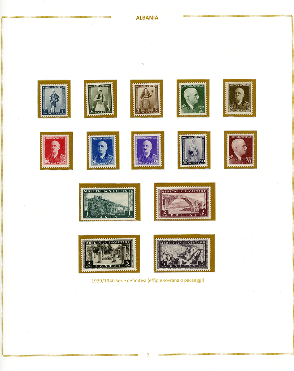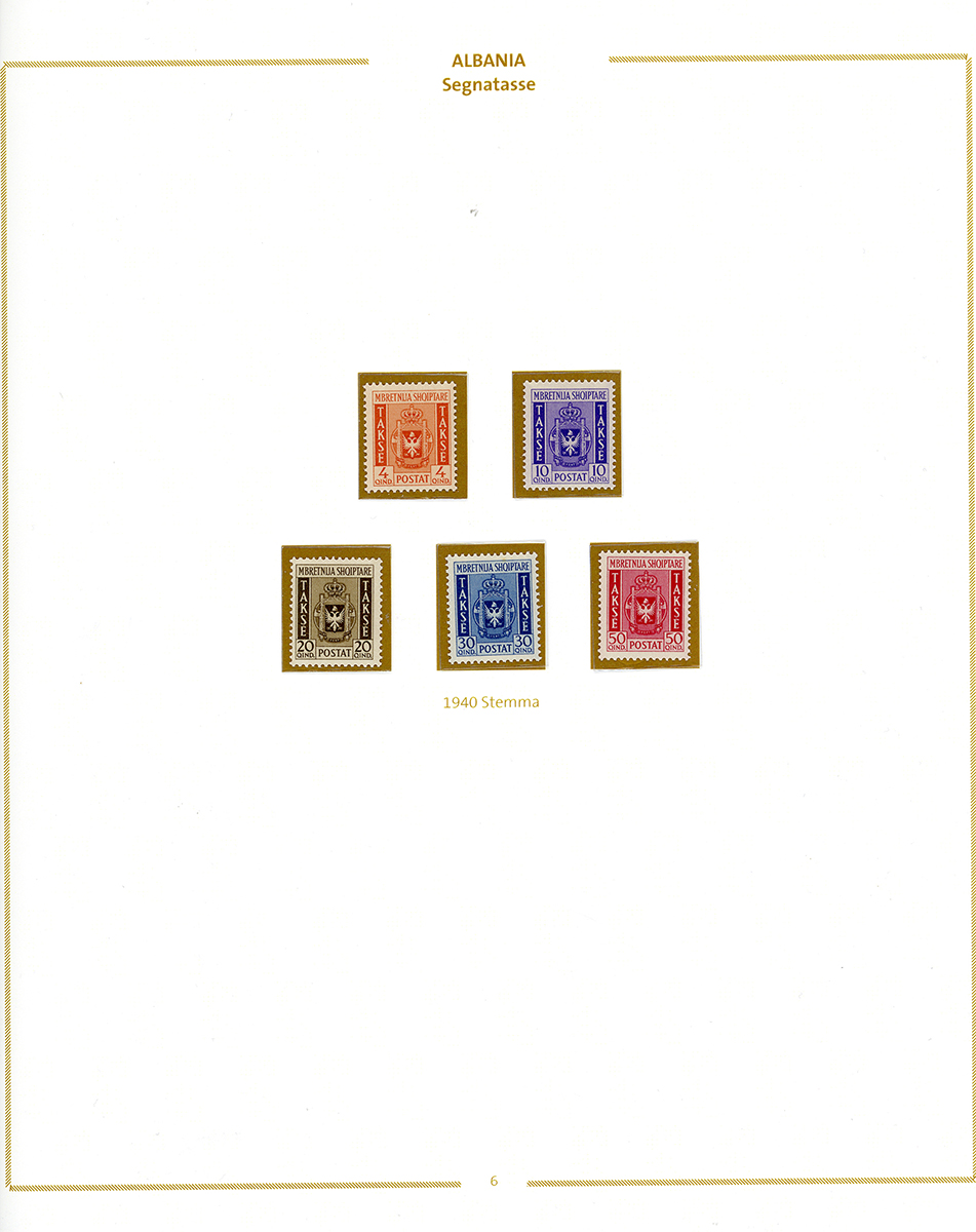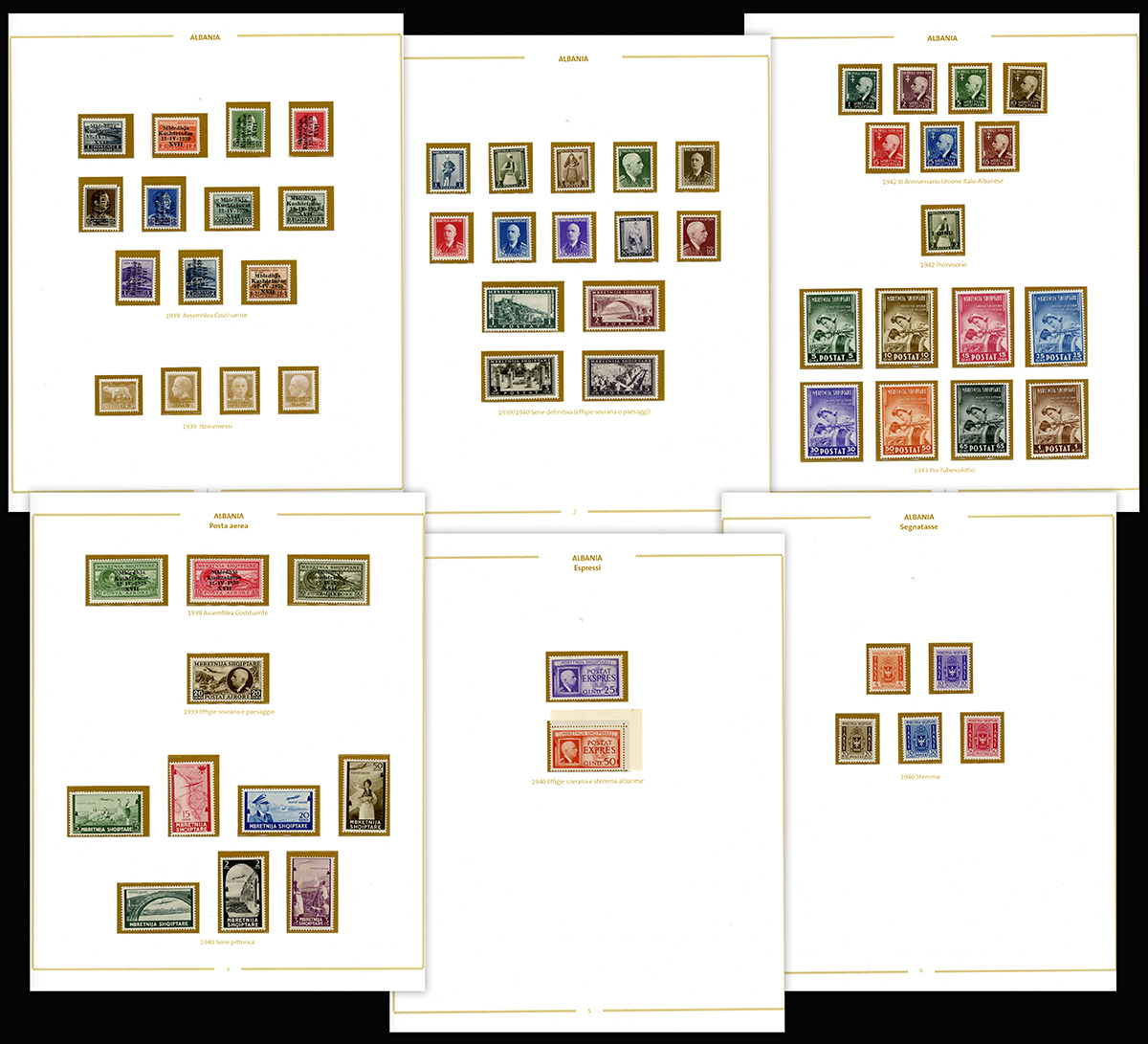 OCCUPAZIONE ITALIANA ALBANIA 1939/1943 - Collezione completa di francobolli e servizi del periodo, mancano solo i non emessi (12/15), nuovi, gomma originale integra, perfetti, in fogli d'album Bolaffi. Ottima qualità generale.