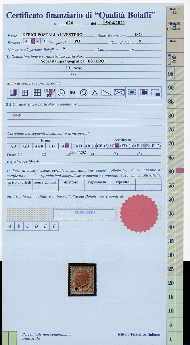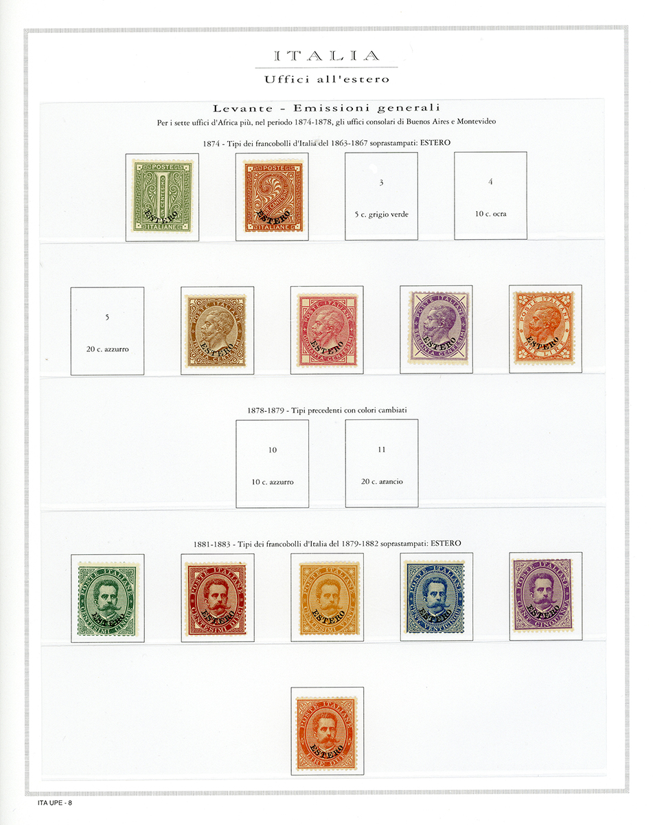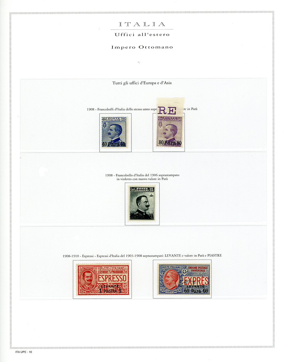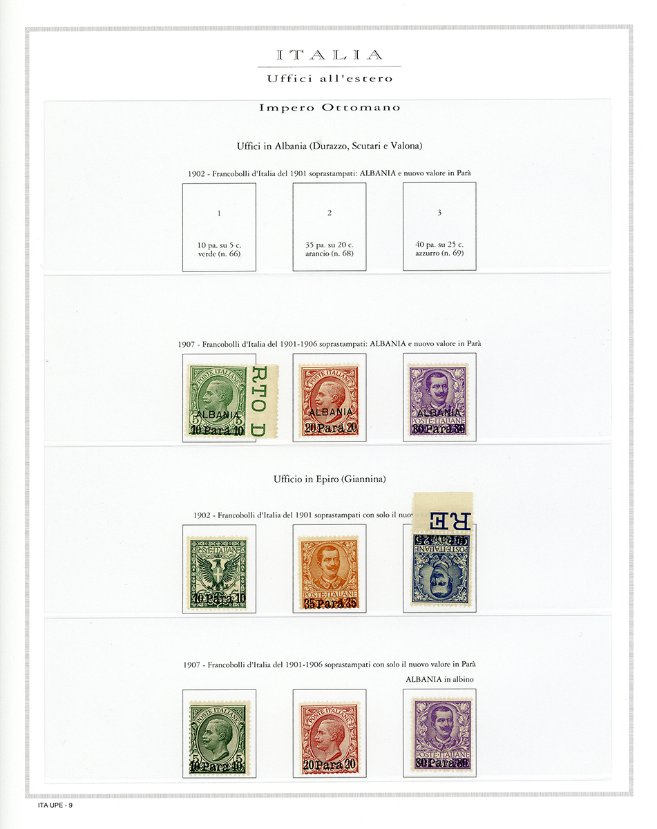 UFFICI POSTALI ITALIANI ALL'ESTERO 1874/1912 - Inizi di collezioni di francobolli delle emissioni generali del Levante, La Canea, uffici in Albania e uffici d'Europa e d'Asia, nuovi, gomma originale integra, perfetti, in fogli d'album Marini. Un cert. finanziario Bolaffi.