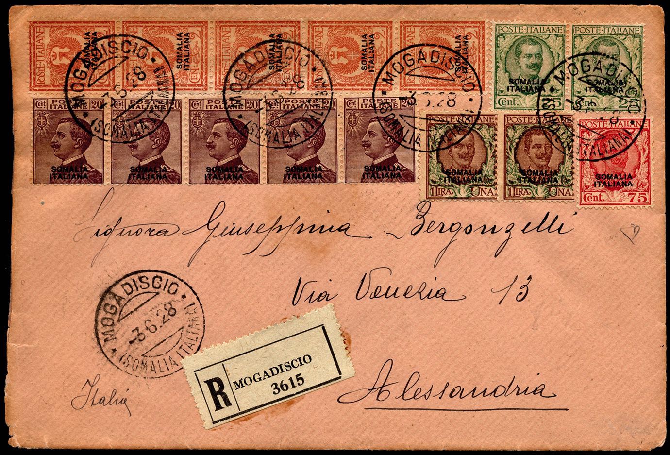 1928 - Floreale e Michetti (98,92,95,96,99), su busta raccomandata da Mogadiscio 3/6/1928 ad Alessandria. Rara affrancatura. Enzo Diena.
