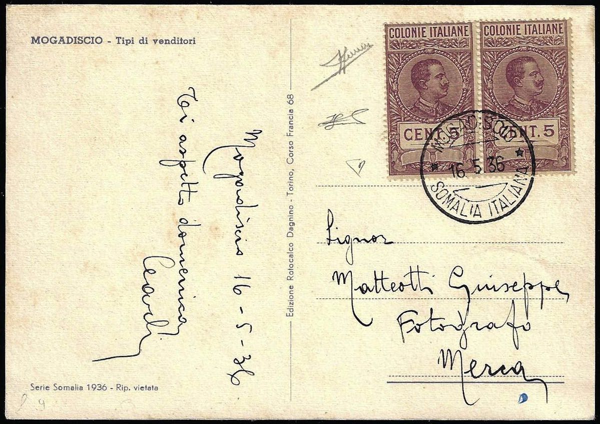 1936 - 5 cent. lilla, marca da bollo per le Colonie, coppia perfetta, su cartolina da Mogadiscio 16/5/1936 a Merca. Molto bella e non ... Leggi tutto